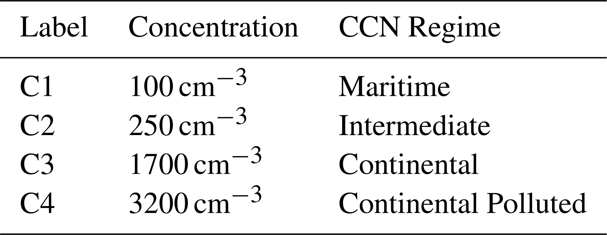 CCN concentration. The activation of CCN from aerosol particles is calculated using look-up tables with pre-calculated activation ratios provided by Segal and Khain (2006). In that scheme, four different CCN concentrations ranging from low to very high concentrations can be chosen (Table 2). The continental CCN concentration (C3) is chosen as the reference concentration, as this aerosol assumption represents typical conditions of central Europe (Hande et al., 2016; Costa-Surós et al., 2020).