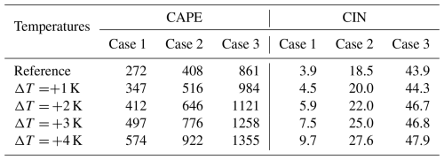 Table 3Maximum values of the time series of domain-mean CAPE and minimum values of CIN, shown for all three case studies and all temperature simulations.