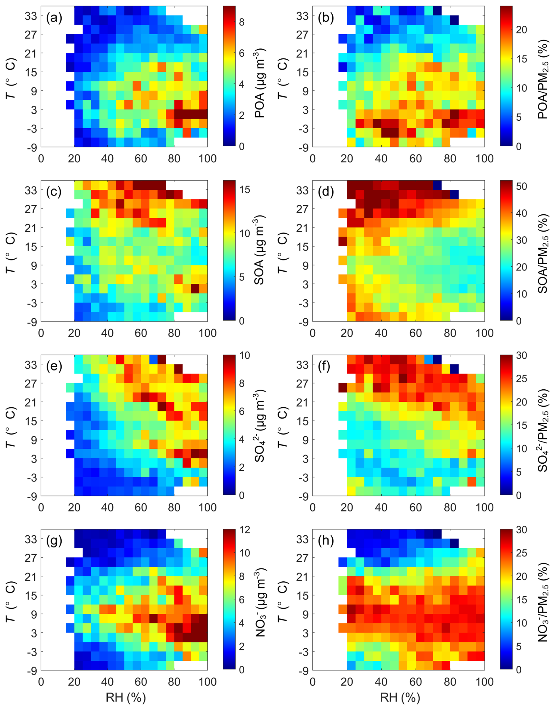 Figure 3 dependence of mass concentrations and mass fractions in PM2.5 of POA, SOA, sulfate, and nitrate for the entire period. The data are grouped into grids with increments of RH and T being 5 % and 3 °C, respectively. Grid cells with the number of data points fewer than 10 are excluded.