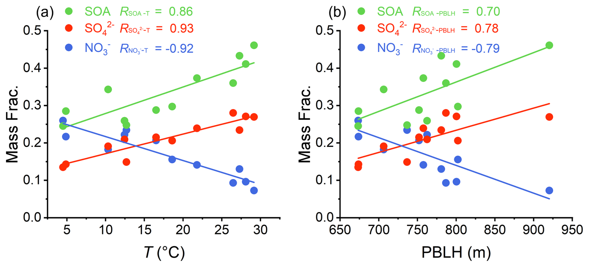 Figure 4The correlation and linear fitting lines between the monthly average mass fractions of SOA, sulfate, nitrate in PM2.5 and the corresponding monthly average (a) T and (b) PBLH. RSOA-T, , : correlation coefficients with T. RSOA-PBLH, , : correlation coefficients with PBLH.