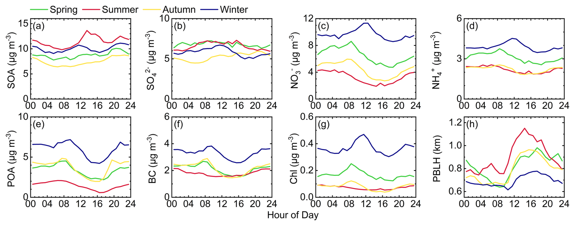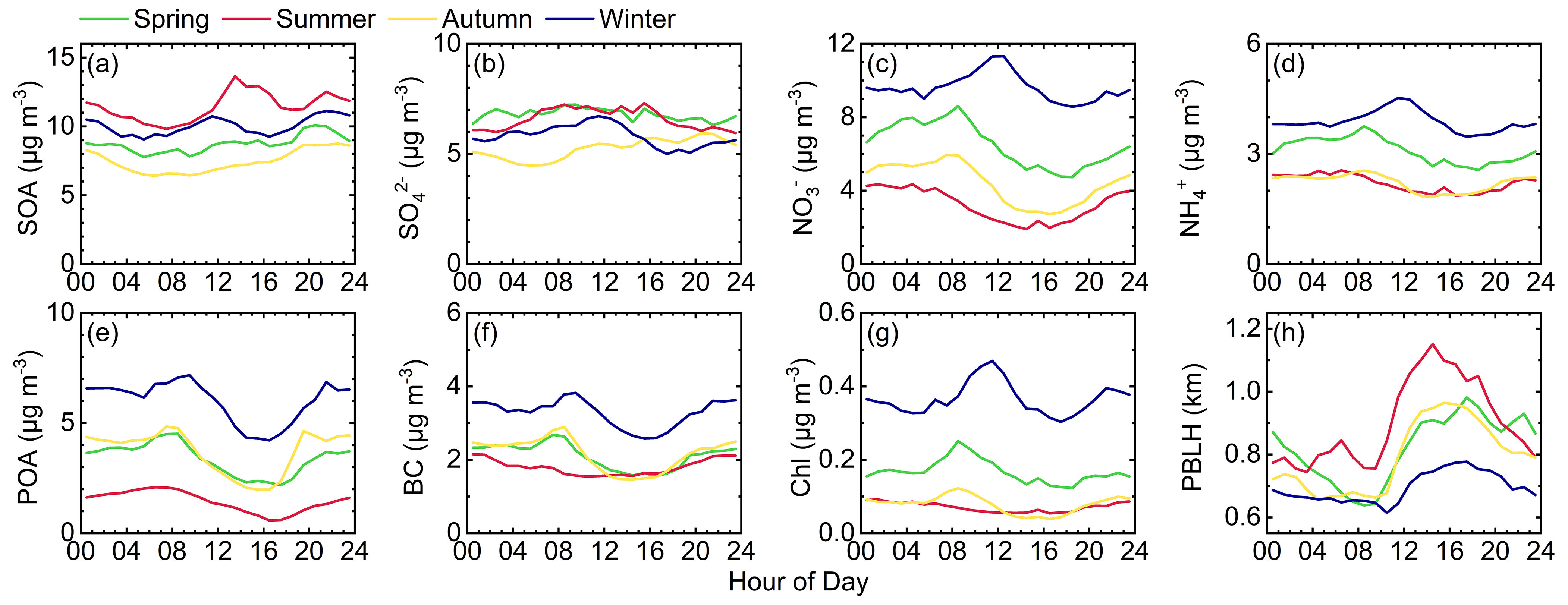 Figure 6Average diurnal variations of (a) SOA, (b) sulfate, (c) nitrate, (d) ammonium, (e) POA, (f) BC, (g) chloride, and (h) PBLH during four seasons.