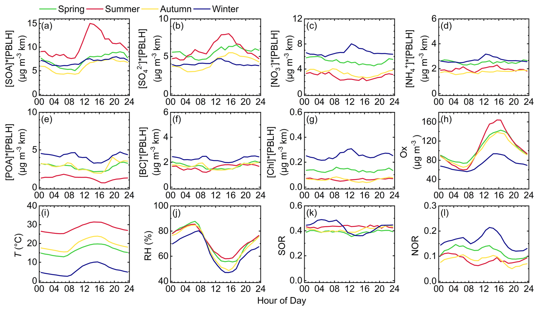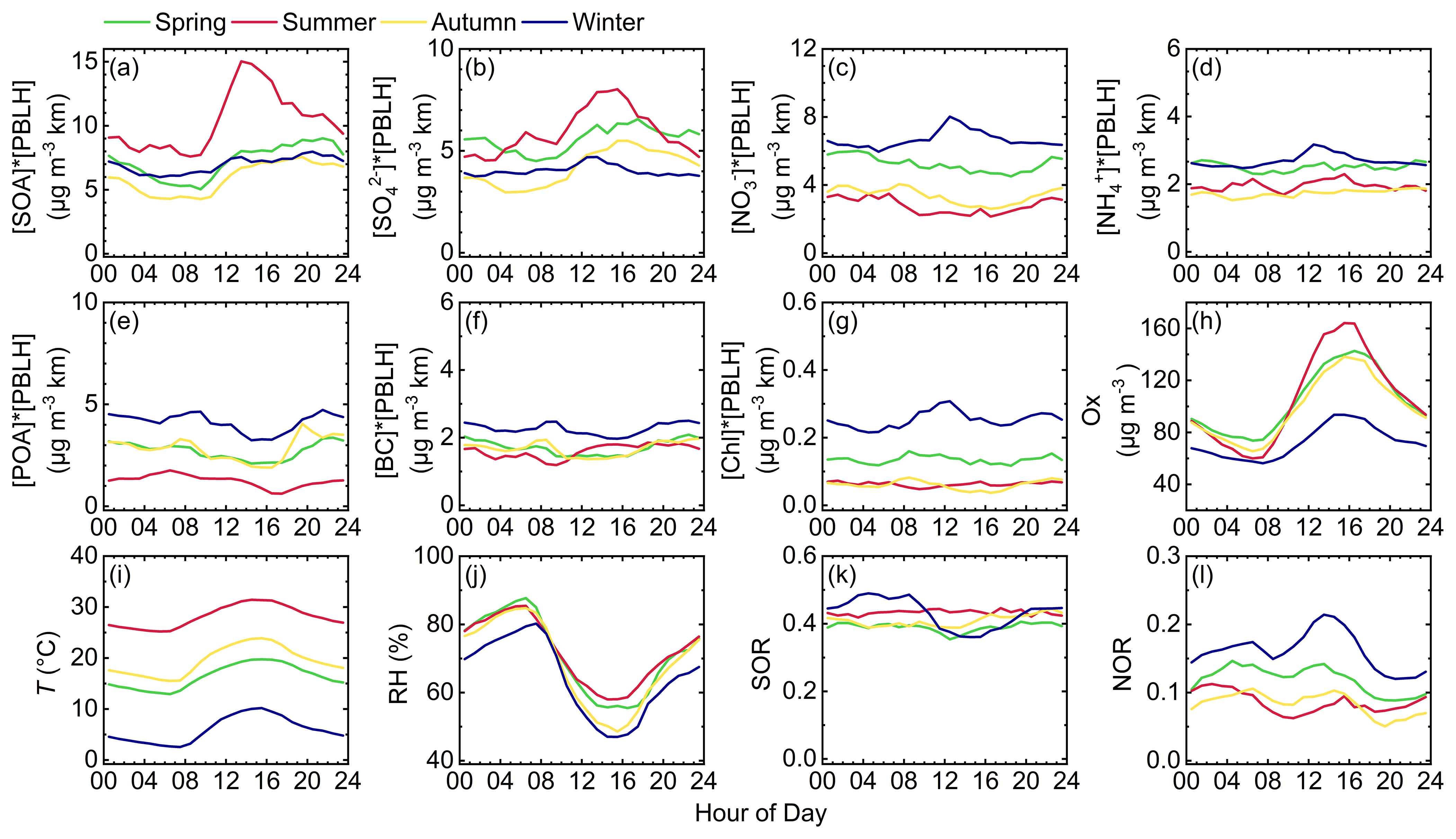 Figure 7Average diurnal variations of (a–g) PM2.5 chemical components after removing the dilution effect of planetary boundary layer, (h) photochemical oxidant (Ox), (i) T, (j) RH, (k) sulfate oxidation ratio (SOR), and (l) nitrogen oxidation ratio (NOR) during four seasons. To isolate emission sources and secondary formation effects on local pollution, the average diurnal variations of PM2.5 chemical components are multiplied by PBLH to remove the dilution effect (denoted as [component]*[PBLH], e.g., [POA]*[PBLH], [BC]*[PBLH]) in a–g panels.