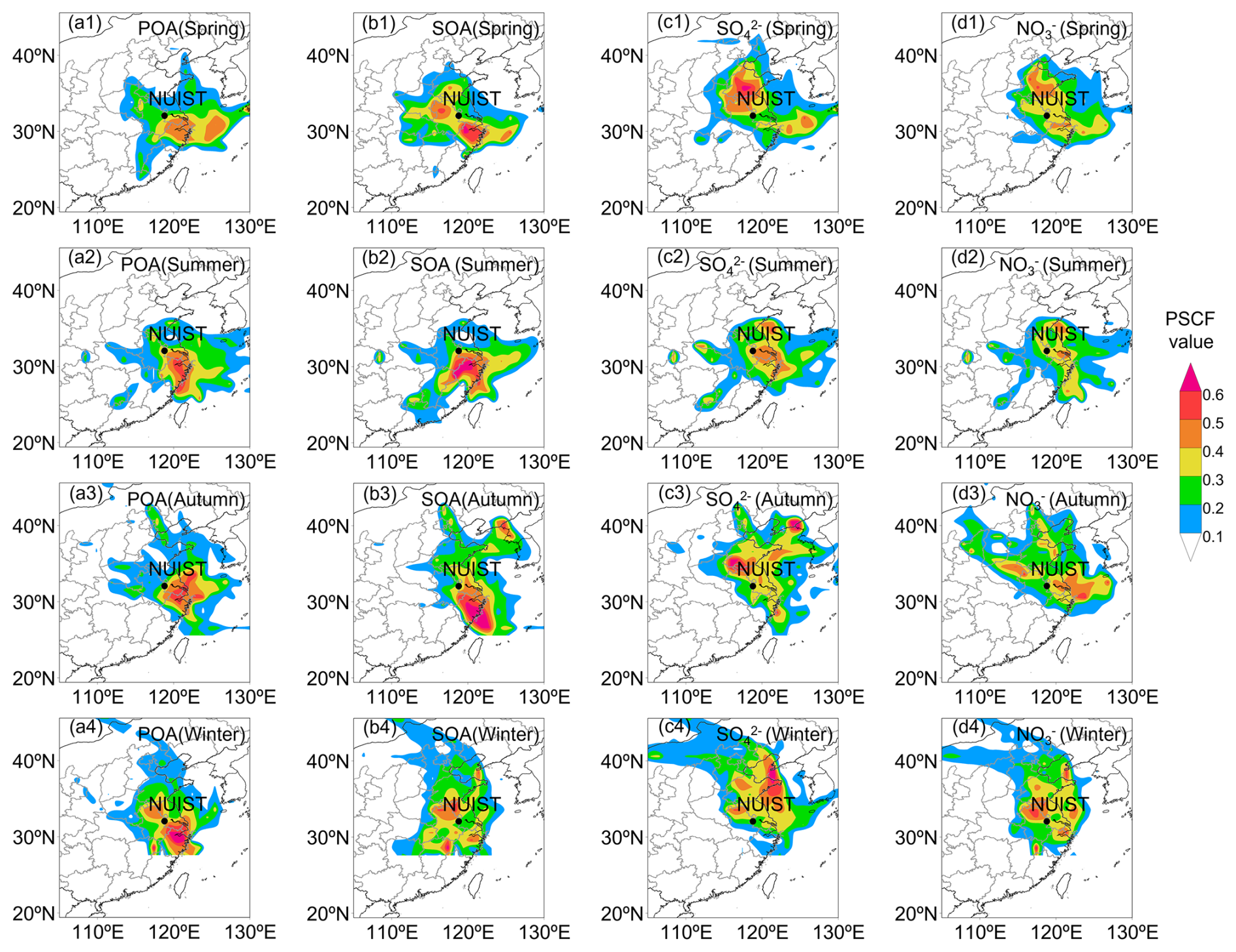 Figure 9PSCF analysis of (a) POA, (b) SOA, (c) sulfate, and (d) nitrate in PM2.5 during four seasons. The black dot indicates the NUIST site. The color scale indicates the values of PSCF.
