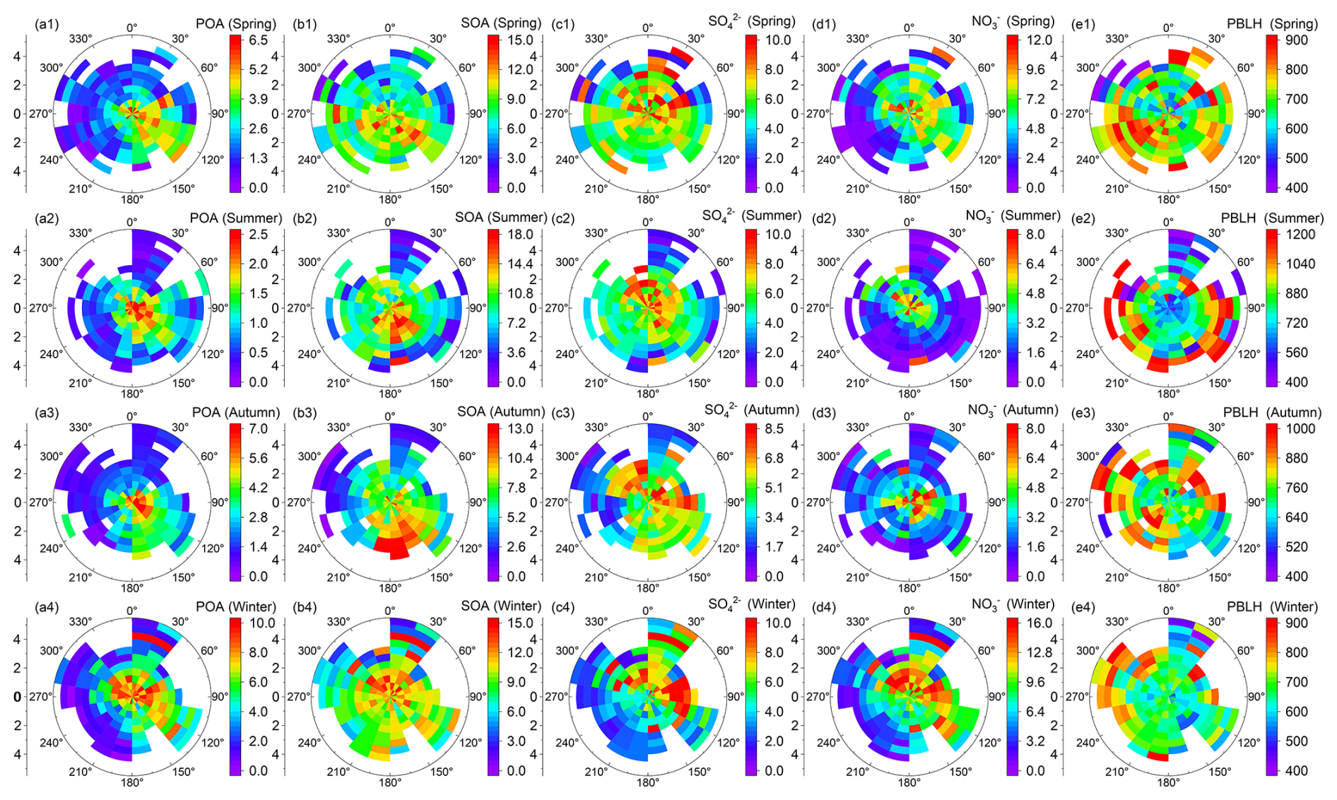 Figure 10Pollution roses of (a) POA, (b) SOA, (c) sulfate, (d) nitrate and (e) PBLH during four seasons. The data are grouped into grids with increments of WS and WD being 0.5 m s−1 and 20°, respectively. The unit of color scale is µg m−3.