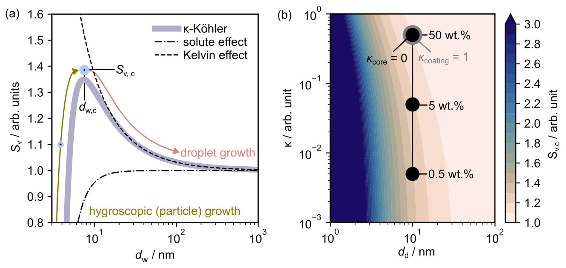 Figure 2(a) Water saturation ratio (Sv) with increasing wet-particle diameter (dw) as the combination of the solute and Kelvin effects. The critical diameter (dw,c) and the associated critical saturation ratio (Sv,c) mark the point at which a particle is considered activated. (b) Sv,c is shown as a function of the dry-particle diameter (dd) and particle hygroscopicity. Values for insoluble (κ=0) particles with variable highly soluble (κ=1) coatings have been shown for reference.