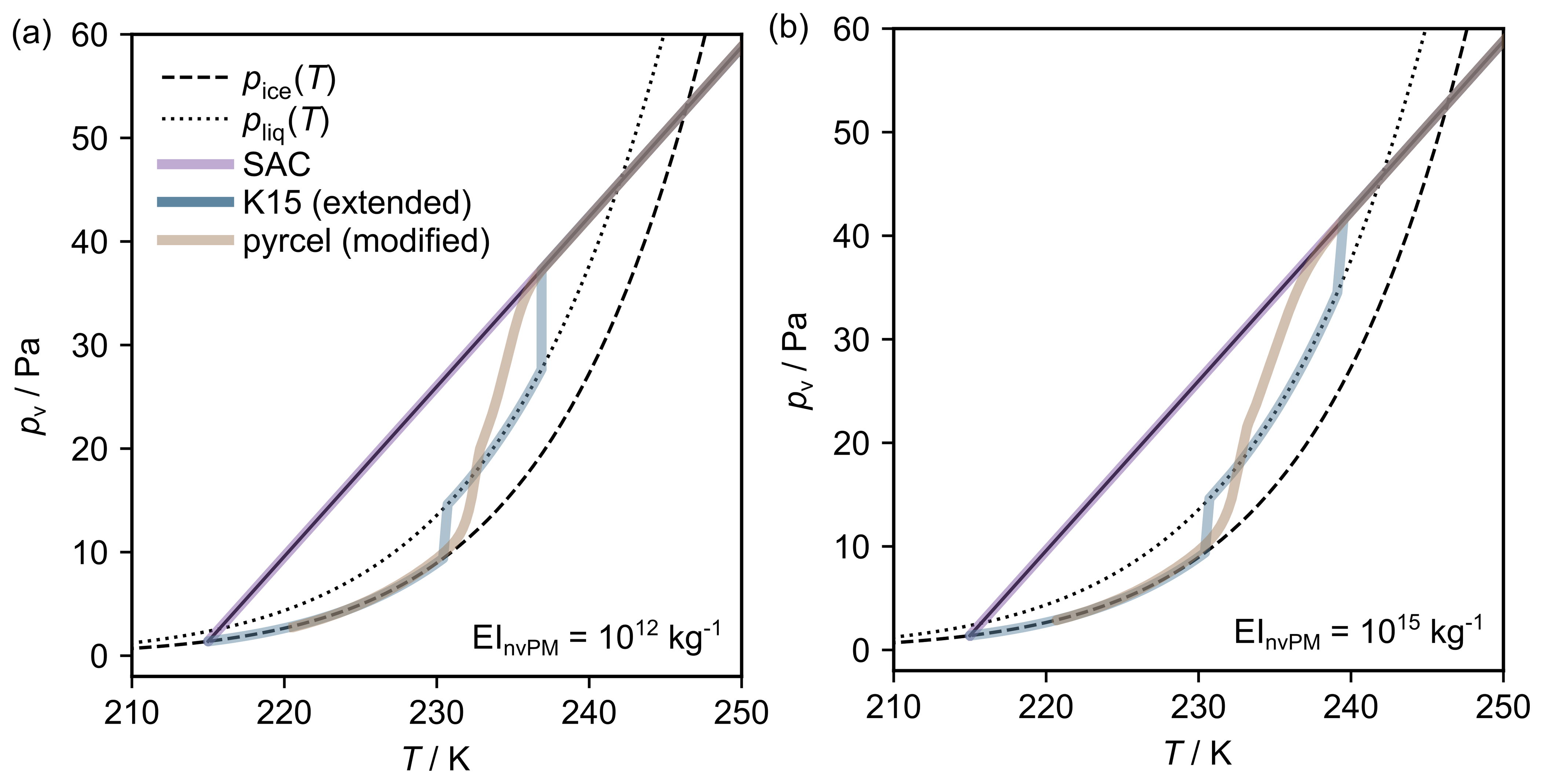 As discussed in Sect. 2.1, the SAC assumes that contrails are formed if the mixing line becomes (super)saturated with respect to water during plume evolution (Sv≥1). However, as outlined in Sect. S3, this criterion cannot be reconciled with the minimum requirement for (even hygroscopic) particle activation.