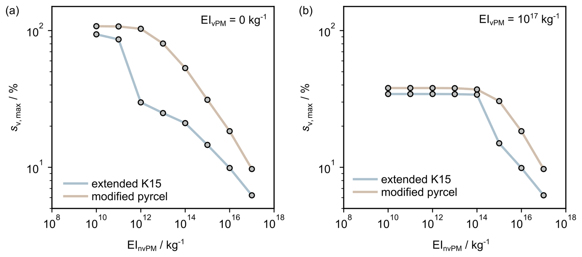 There are two outstanding limitations in the extended K15 model that cannot be resolved. Firstly, we found no means of introducing the Kelvin correction into the solution for Lw (via the droplet growth equation). Omitting the Kelvin effect in the droplet growth equation acts to increase the radial growth rate (Sect. S2). Hence, the ability for droplets to deplete the plume supersaturation is increased, so a lower droplet number concentration is required to quench the ambient supersaturation. This effect is relevant for smaller particles such as plume vPM, where the magnitude of the Kelvin correction is increased. Secondly, an analytical solution for the inner integral of Eq. (25) requires that Lw is independent of the plume supersaturation so that droplet formation at time t0<t does not deplete the plume supersaturation at time t. However, as defined in Eq. (25), Lw is coupled to the plume supersaturation via the droplet growth equation. We anticipate this may be problematic when two or more particle types with comparable number concentrations but different Sv,c coexist. Here, one particle type will preferentially activate and grow, subsequently depleting the supersaturation available for the second particle type and thereby inhibiting its activation and growth. For this reason, the extended K15 does not account for the temporal depletion of supersaturation or competition between particle types.