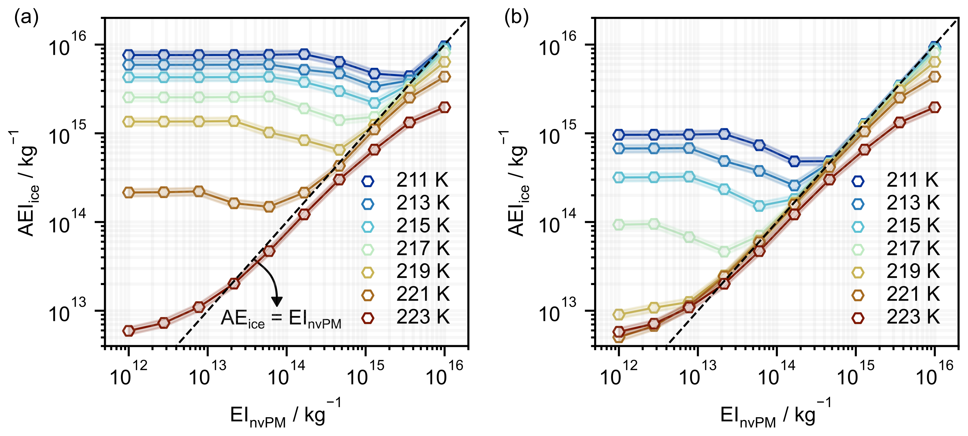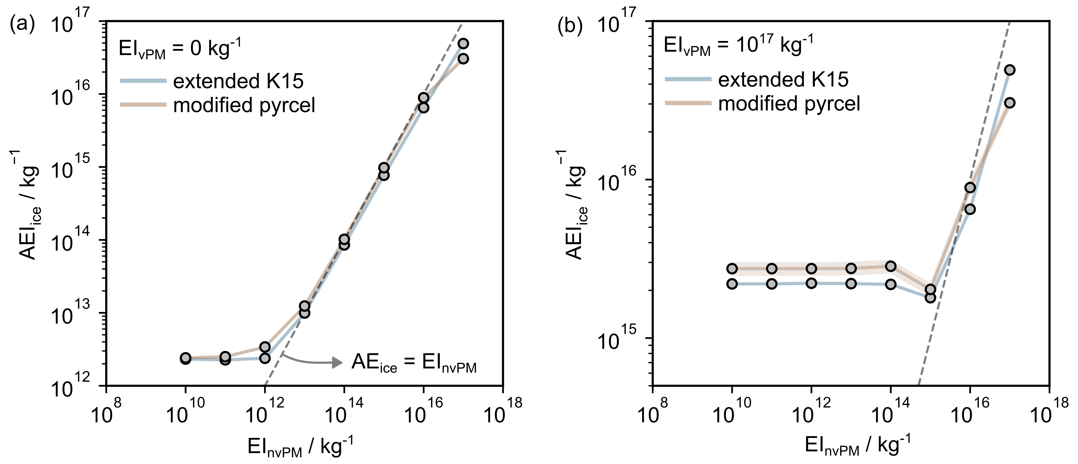 We use a conservative parameter space for the properties of each particle mode; see Table 1. We note that both EInvPM and the particle size distribution characteristics can change with the use of sustainable aviation fuel (SAF) (Märkl et al., 2024; Schripp et al., 2022); however, these fall within larger uncertainties in our simulations. Recently, contrail parcel model simulations have been performed assuming a smaller dg,nvPM, consistent with the primary particle diameter rather than the aggregate particle diameter (Yu et al., 2024). While the ice-nucleating ability of larger soot particles has been shown to depend on particle morphology (Marcolli et al., 2021), there is a paucity of data available for activation and ice nucleation on surrogate aircraft nvPM. Therefore, here we choose to identify dg,nvPM as the aggregate particle diameter in line with other studies (Kärcher et al., 2015). Nevertheless, we evaluate the model sensitivity to the choice of nvPM primary particle or aggregate diameter in detail (see Sect. S10) and find that (i) AEIice predictions agree within 40 % and that (ii) the functional behaviour is similar. Finally, we assume that the nvPM mode contains a 1 wt % coating of soluble material as observed for ground-based emissions testing at moderate fuel sulfur content (FSC) (Gysel et al., 2003) and is therefore characterised by κ= 0.005 in accordance with the original K15.