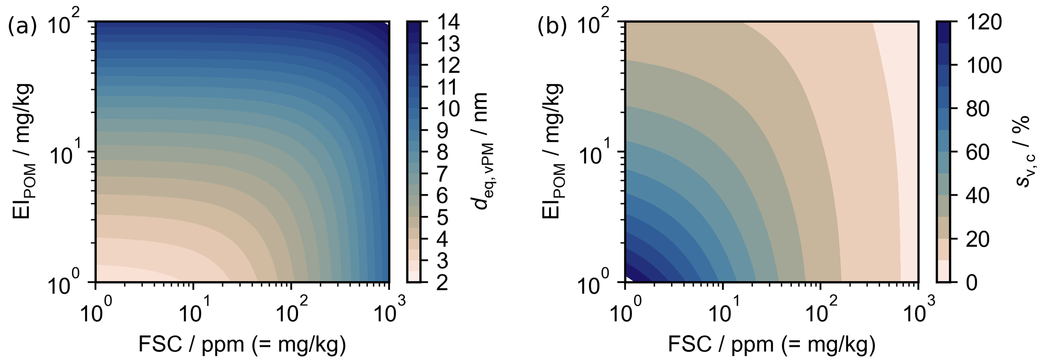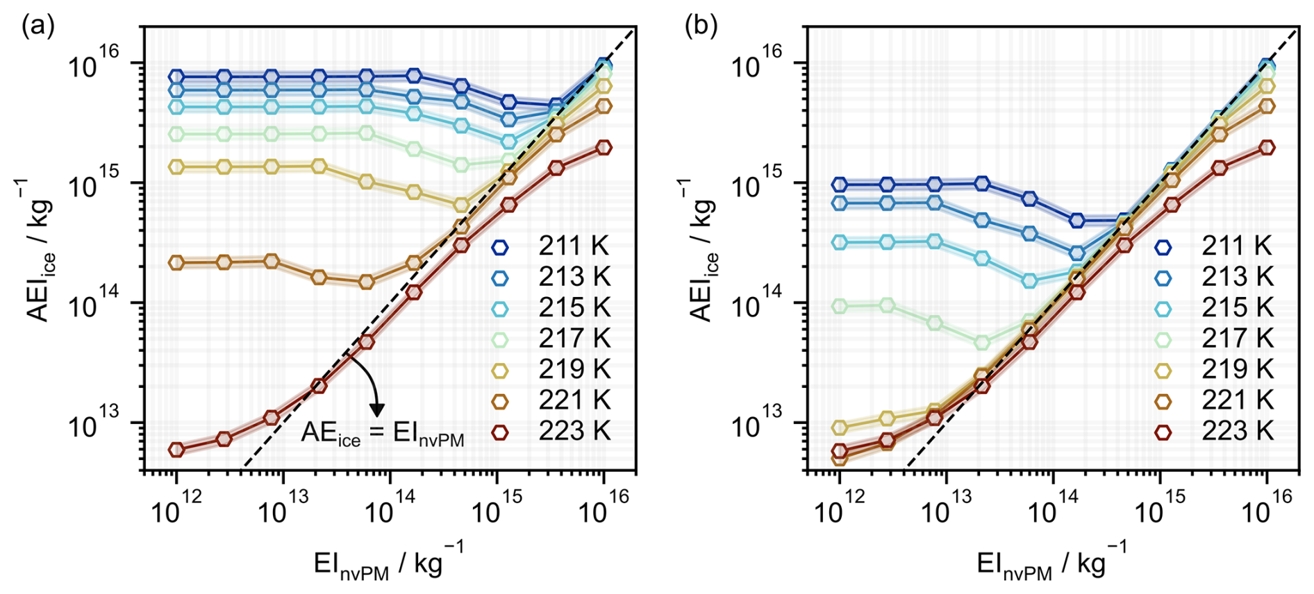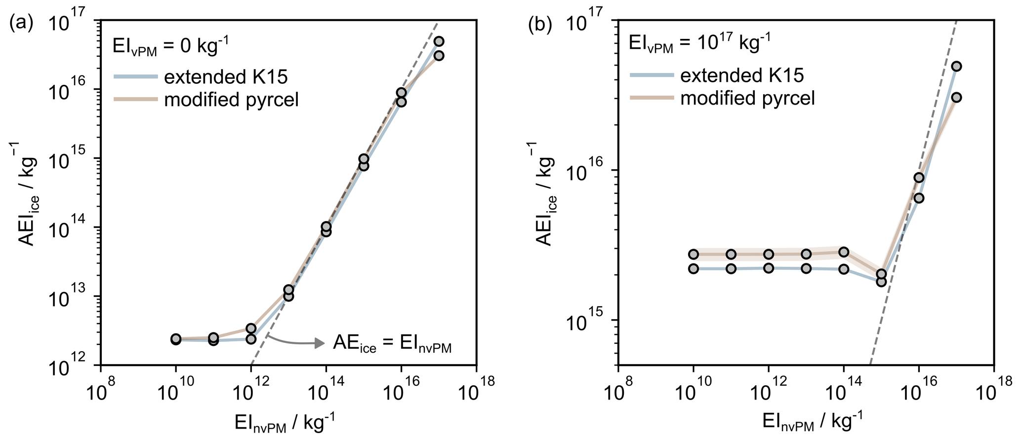 EInvPM varies by several orders of magnitude depending on the fuel and engine type (EASA, 2025), with most engines operating in the “soot-rich” regime, where the majority of contrail ice crystals form via nvPM particles (Kärcher and Yu, 2009). Larger nvPM particles (dg,nvPM>dg,vPM) activate preferentially in the plume and can suppress water uptake on plume vPM particles, defining “soot-rich” baseline conditions of approximately EInvPM>1015 kg−1 (Kärcher, 2018). Upon reducing EInvPM, size differences no longer compensate for differences in relative abundance, and concentrations of activated nvPM and plume vPM become comparable, characterising the “transition regime” (Kärcher and Yu, 2009). Here, baseline conditions depend sensitively on the characteristics of all particle species. Recent developments in lean-burn technology have been shown to further reduce EInvPM into the “soot-poor” regime, where activated number concentrations become independent of EInvPM as EInvPM decreases. “Soot-poor” baseline conditions have been shown to depend on the relative concentration of ambient particles and the characteristics of plume vPM, including EIvPM and dg,vPM (Yu et al., 2024). Nevertheless, while the role of vPM has been evidenced in model simulations of individual contrails, these effects have not yet been incorporated into global mean contrail cirrus ERF estimates (Bier and Burkhardt, 2022; Teoh et al., 2024).