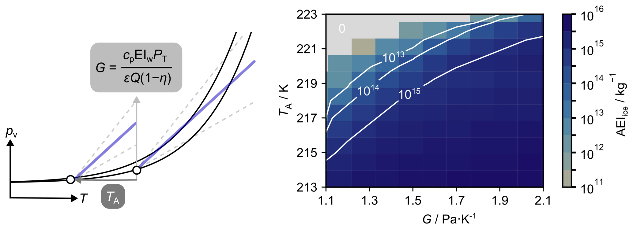 where pv,E and pv,A represent the partial pressure of water in the exhaust and ambient air, respectively, and G is the gradient of the mixing line. Provided we know the ambient conditions (pv,A, TA) and TE, to fully constrain Eq. (1), we must also define either pv,E or G. Conveniently, the latter has been shown to depend on the aircraft and fuel properties (Schumann, 1996):
