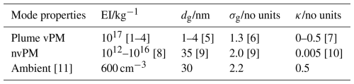 For the plume vPM mode, we identify a provisional size range of 1 <dg,vPM/ nm < 4 and a σg,vPM of 1.3 (Kärcher et al., 2000; Yu et al., 1998). Similarly, we assume a fixed emission index EIvPM=1017 kg−1 in line with modelling and observational evidence (Arnold et al., 2000; Haverkamp et al., 2004; Schumann et al., 2002; Sorokin and Mirabel, 2001). This is also supported by newer observational evidence (Voigt et al., 2025) that the total particle emission index (particle sizes > 5 nm) is on the order 1015 kg−1, which is consistent with EIvPM=1017 kg−1 if dg,vPM=2.7 nm and dg,vPM=1.3. Concerning particle hygroscopicity, we assume a mixed plume vPM mode comprising sulfuric acid (κ=0.5) and condensable POM, for which we use a conservative lower bound of κ=0 in line with measurements of non-hygroscopic lubrication oil droplets (Ponsonby et al., 2024). However, we acknowledge that the value of κ for condensable POM is likely to vary with changes in fuel and/or engine architecture. To that end, we evaluate our sensitivity analyses in the extreme cases of both sulfur-rich plume vPM (volume mixing ratio of 95:5 sulfuric acid : condensable POM; 0.05⋅κPOM + 0.95κH2SO40.5) and organic-rich plume vPM (volume mixing ratio of 5:95 for sulfuric acid : condensable POM; 0.95⋅κPOM + 0.05κH2SO40.01). In Sect. S9, we investigate the impact of assuming all plume vPM particles have the same chemical composition (κ). To achieve this, we divide the plume vPM mode into two distinct plume vPM modes, prescribing these with identical physical characteristics but dissimilar κ. We find that the results of the two-mode system are similar to those of the single-mode system, with a modified value of κ. Therefore, we argue that our range of κ is sufficient to capture a degree of variation in chemical composition between vPM particles.