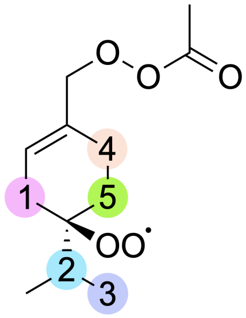 Figure 5Labelling for H-shift reactions of the limonene peroxyl radical. The numbers on the scheme correspond to the numbering in Table 2.