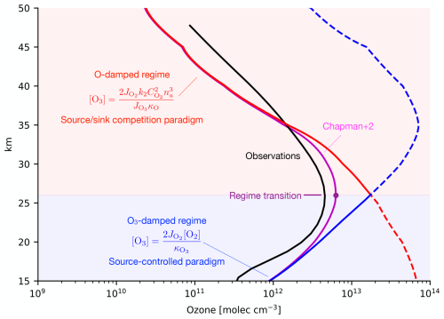 Figure 5 shows the observed [O3] profile (black) compared to ozone in the Chapman+2 model (magenta) and its limits in the O-damped regime (solid red) and O3-damped regime (solid blue). Above 26 km, [O3] closely follows the scaling from the O-damped regime (solid red). Below 26 km, [O3] closely follows the scaling from the O3-damped regime (solid blue). To examine where each regime predicts peak [O3], these theoretical scalings can be artificially extended beyond where they formally apply (dashed curves). When the O-damped regime is extended downwards (red dashed curve), it predicts an interior maximum at 15 km, far below the ozone maximum and its range of applicability. When the O3-damped regime is extended upwards (blue dashed curve), it predicts an interior maximum at 35 km, far above the ozone maximum and its range of applicability. These predictions for peak [O3] are similar to those shown in Fig. 2, except now they are formulated as quantitative limits of the Chapman+2 model, they use self-consistent photolysis rates as part of the Chapman+2 model solution, and they include (modest) altitude-dependent contributions from κO and . Figure 2 first suggested limitations of the prevailing paradigms, and Fig. 5 confirms that these limitations verge on being paradoxical: each textbook paradigm is capable of producing an interior maximum, but these maxima occur at the wrong altitude and in a region where they do not apply.