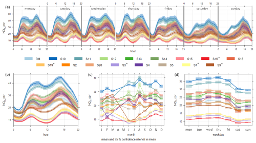 Figure 7Daily (a), hourly (b), monthly (c) and weekly (d) corrected NO2 concentrations (ppb) measured by all low-cost sensors (LCSs S2-S20) and by the Prague Legerova reference monitor (RM) within the Legerova campaign. Measuring period from 30 May 2022 to 28 March 2023 (in monthly graph May to December 2022, January to March 2023). LCSs located at background sites are marked with an asterisk.