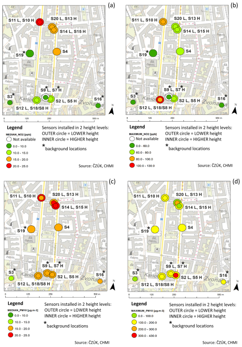 Figure 9Map with measurement locations showing (a) median and (b) maximum NO2 concentrations (ppb) and (c) median and (d) maximum PM10 concentrations (µg m−3). Both were measured during the entire measurement period (from 30 May 2022 to 28 March 2023) in Legerova and its surroundings. The sensors were placed at two height levels in six locations (see legend). The colour scales differ between median and maximum concentrations and between pollutants. Background map is provided by WMS by the Czech Office for Surveying, Mapping and Cadastre – ČÚZK.