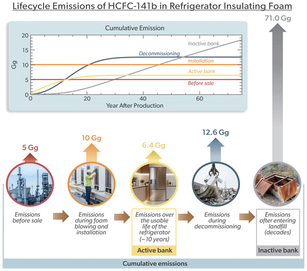 This study presents a new bottom-up model to estimate emissions and banks of long-lived ozone-depleting substances. It is applied here to HCFC-141b. Calculated global emission trends are qualitatively consistent with atmospheric observations from 1990–2017. However, they diverge after 2017, suggesting either a growing additional source or a model deficiency. The easily recoverable portion of the bank is projected to be smaller than previously estimated, impacting future recovery feasibility.