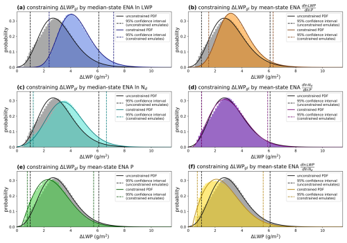 Figure 11ΔLWPgl is constrained by individual constraints, with the color-shaded region in each plot representing the constrained distribution and the gray region representing the prior distribution. These constraints are (a) median-state ENA ln LWP, (b) , (c) median-state ENA ln Nd, (d) , (e) mean-state ENA P, and (f) . Vertical black lines are the 95 % CIs for unconstrained emulate distributions, and colored vertical lines are the 95 % CIs for constrained emulate distributions.