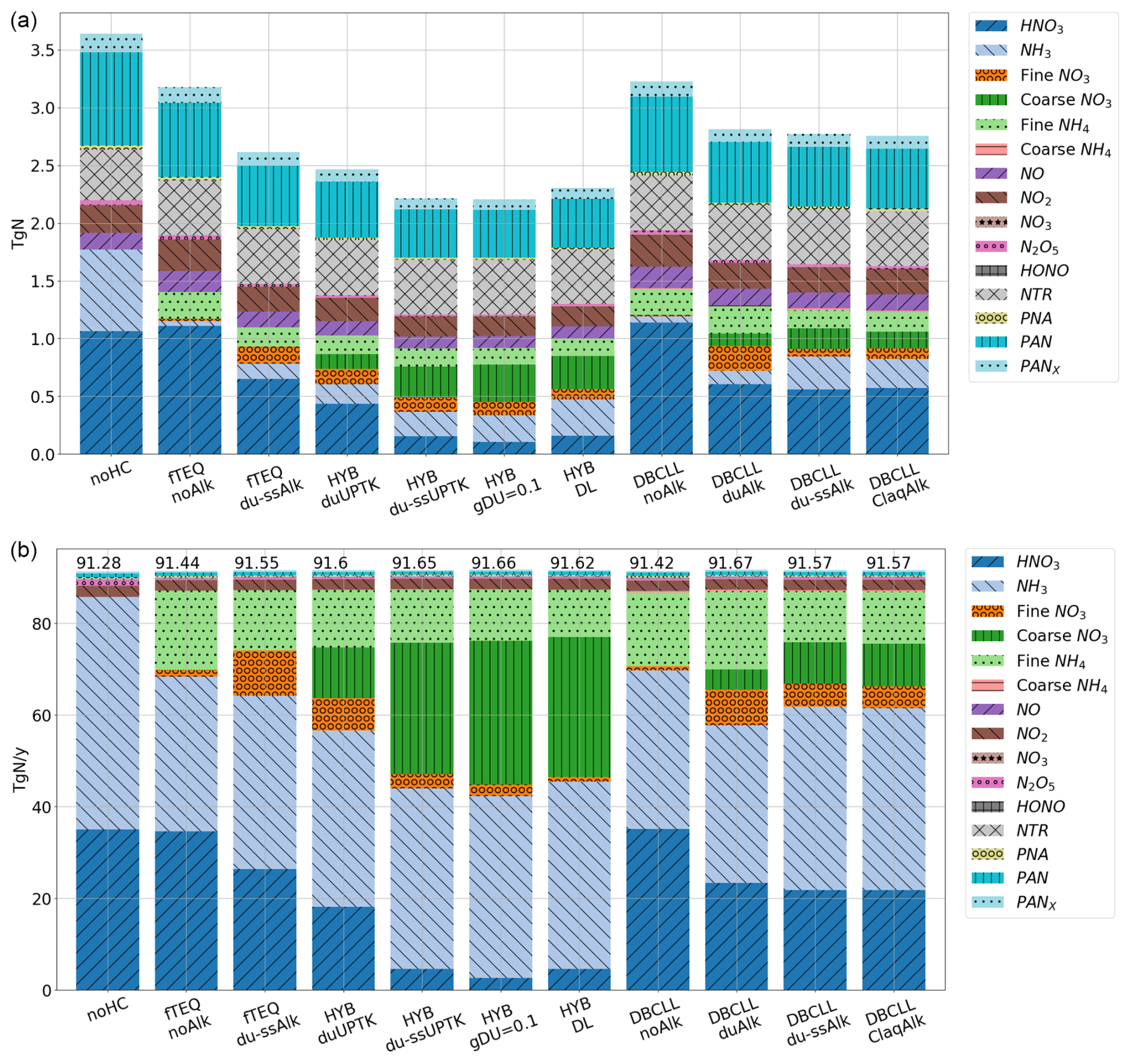 Three initial run sets are conducted neglecting coarse formation, serving as a comparison reference for following experiments including coarse . The noHC run assumes that there is no formation of , , or aerosol through heterogeneous chemistry on any aerosol particle, serving as a baseline to estimate the burden of gas condensing in particles in other configurations and the influence of particle formation on nitrogen deposition rates. Additionally, two sensitivity experiments with fTEQ are included to discuss the impact of ignoring the partitioning of semivolatile inorganic species on coarse particles: fTEQ_noAlk neglects the presence of dust or SS in the aerosol mixture (Reactions R6–R7 in Table 1), while fTEQ_du-ssAlk considers TEQ between gas and NVCs in the fine modes of dust and SS particles (Reactions R6–R12 in Table 1).