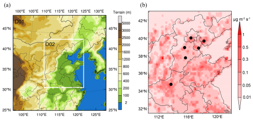 Figure 1(a) The model domain. (b) Emission rate of primary PM2.5 and the location of observation sites. Black dots are pollution sites.