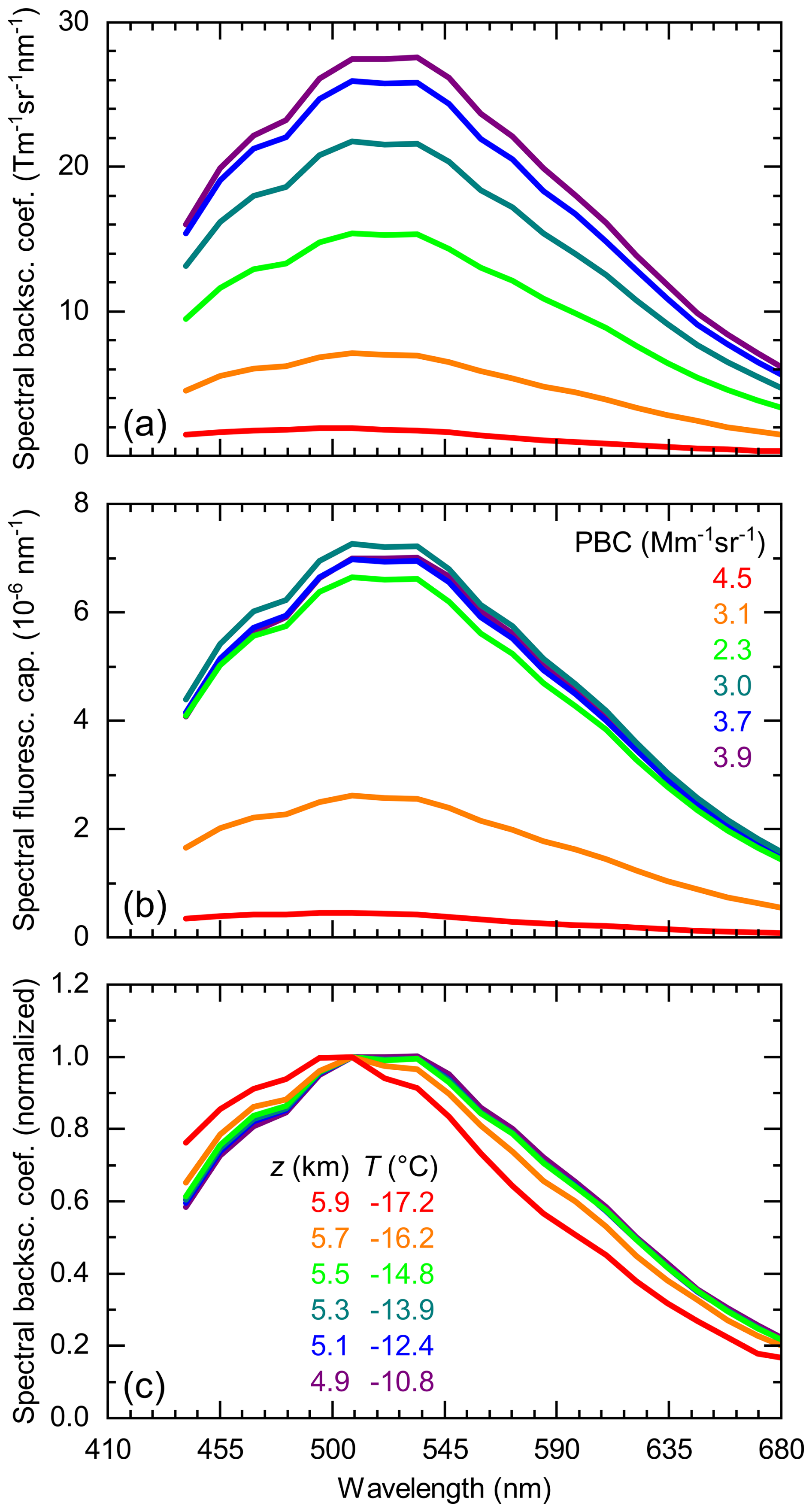 Spectra of βFL (Fig. 6a) and capacity (Fig. 6b) exhibit a similar shape, but the capacity spectra are closer together, implying that some of the variability seen in Fig. 6a is due to changes in the number density of the fluorophores rather than changes in their inelastic properties. The BBA spectrum is broad and has no distinctive features. In this measurement, it peaks between 505 and 518 nm. From its maximum it slopes down to shorter and longer wavelengths, reaching similar values at the far ends of the spectrometer measurement range. The drop on the blue shoulder is faster than on the red shoulder, but overall the BBA spectrum can be described as quite symmetrical. With height, the spectrum becomes increasingly Gaussian without, in this case, the central wavelength shifting. In contrast, the spectrum of boundary layer aerosol is asymmetrical and can therefore be clearly distinguished from the BBA spectrum. The maximum lies at blue colors (here at 441 nm), wavelengths so short that λb cannot be determined because it falls outside the spectrometer range (Fig. 5d). The long-wavelength shoulder declines slowly and nearly evenly.