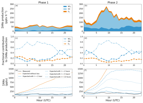 Figure 6Panels (a) and (b) show the mean diel profiles of the AN production rates from NO3-, OH- and O3-initiated oxidation of a monoterpene mixture consisting of 20 % limonene, 15 % β-pinene and 65 % α-pinene for phase 1 and 2, respectively. The fractional contribution to the ANs for each oxidant is plotted in panels (c) and (d). Panels (e) and (f) show the average diel profile across the two phases for the measured alkyl nitrates (black), expected alkyl nitrates with (blue) and without (orange) any losses, where the different blue lines were calculated using different effective lifetimes of the alkyl nitrates.