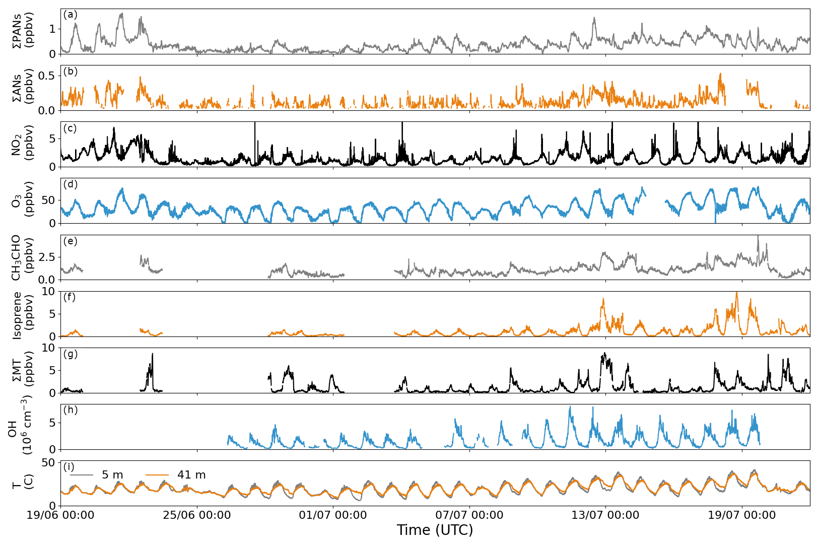 Figure 2Time series of 10 min averages of PANs, ANs, acetaldehyde, isoprene, and sum of monoterpenes (MT); 12 min averages of OH radicals; and 1 min averages of NO2, O3, and temperature at 5 and 41 m during the ACROSS campaign.