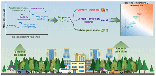 We studied the invisible gas isoprene, which trees and vehicles release into the air and which can worsen urban smog. Using advanced computer learning trained on measurements from many cities, we uncovered how temperature, sunlight, and city greening shape isoprene levels. Comparing Hong Kong and London, we found climate warming boosts isoprene and future ozone pollution, but strong cuts in anthropogenic emission could limit this impact.