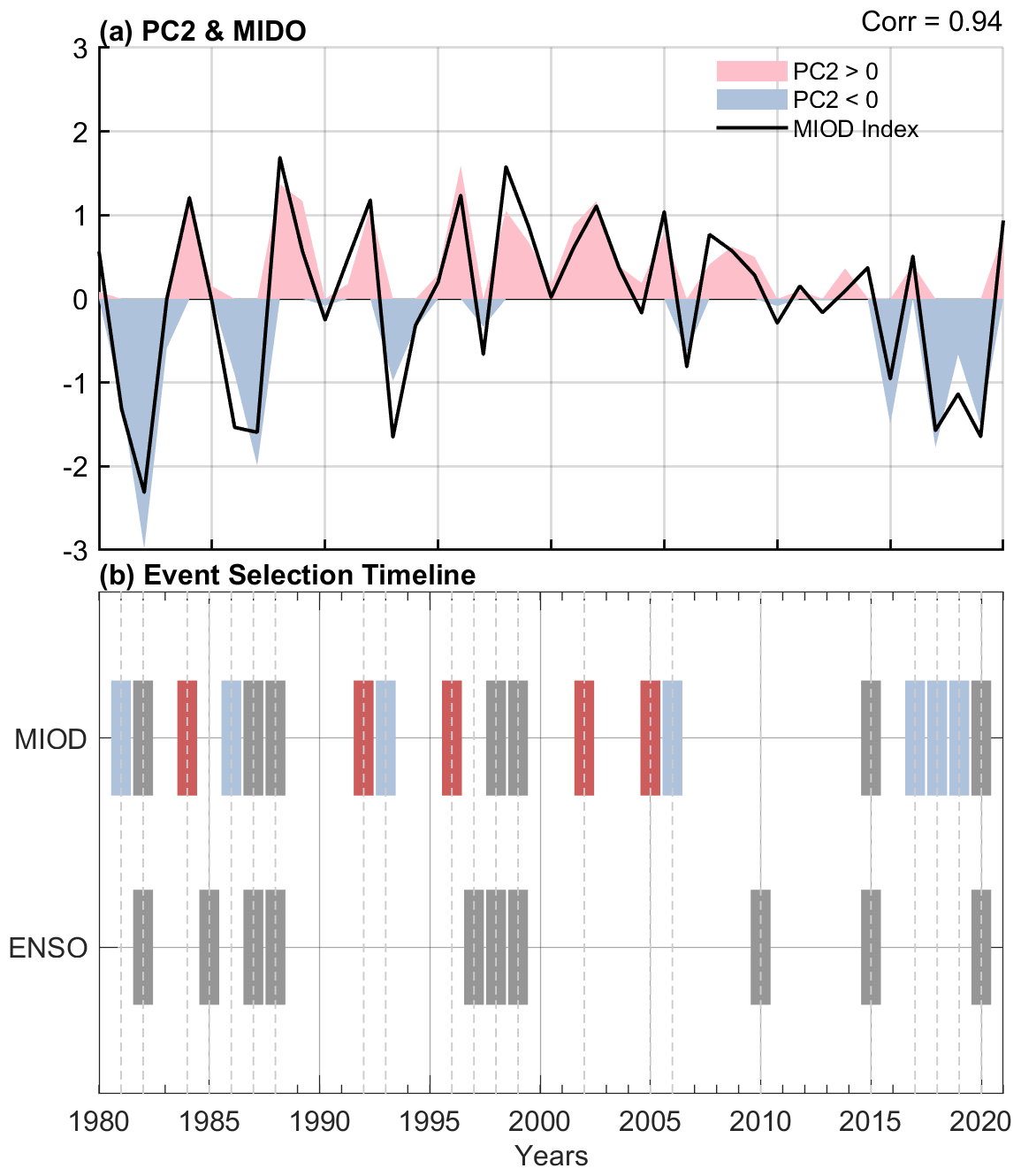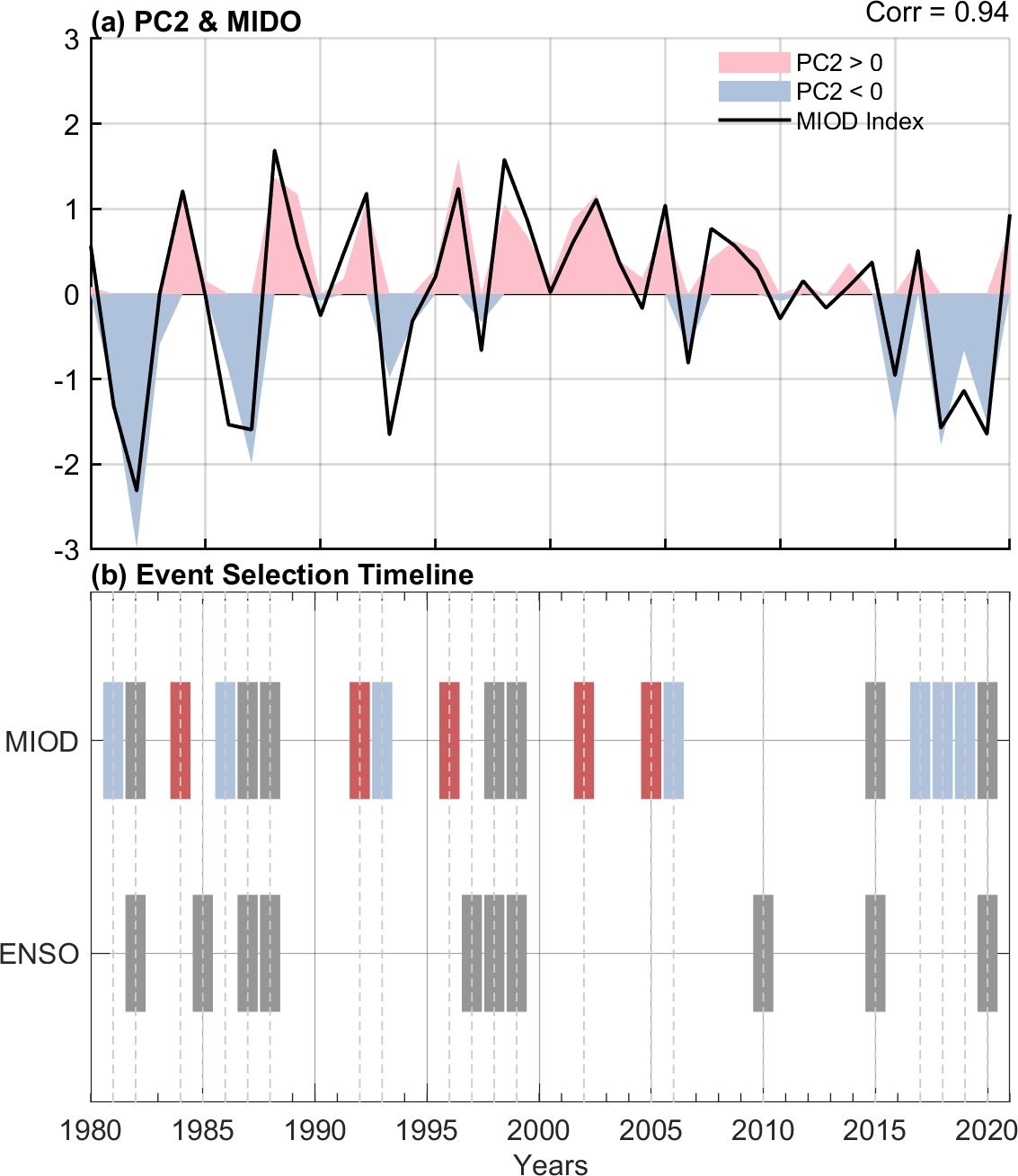 Figure 2(a) Austral winter (JJA) MIOD index (black) and PC2 time series, with positive (negative) PC2 values shaded in red (blue). (b) Two-line timeline summarizing MIOD event selection. Gray bars mark ENSO years. Red and blue bars represent positive and negative MIOD anomalies, respectively, while gray bars in the MIOD row indicate years in which MIOD events overlap with ENSO.