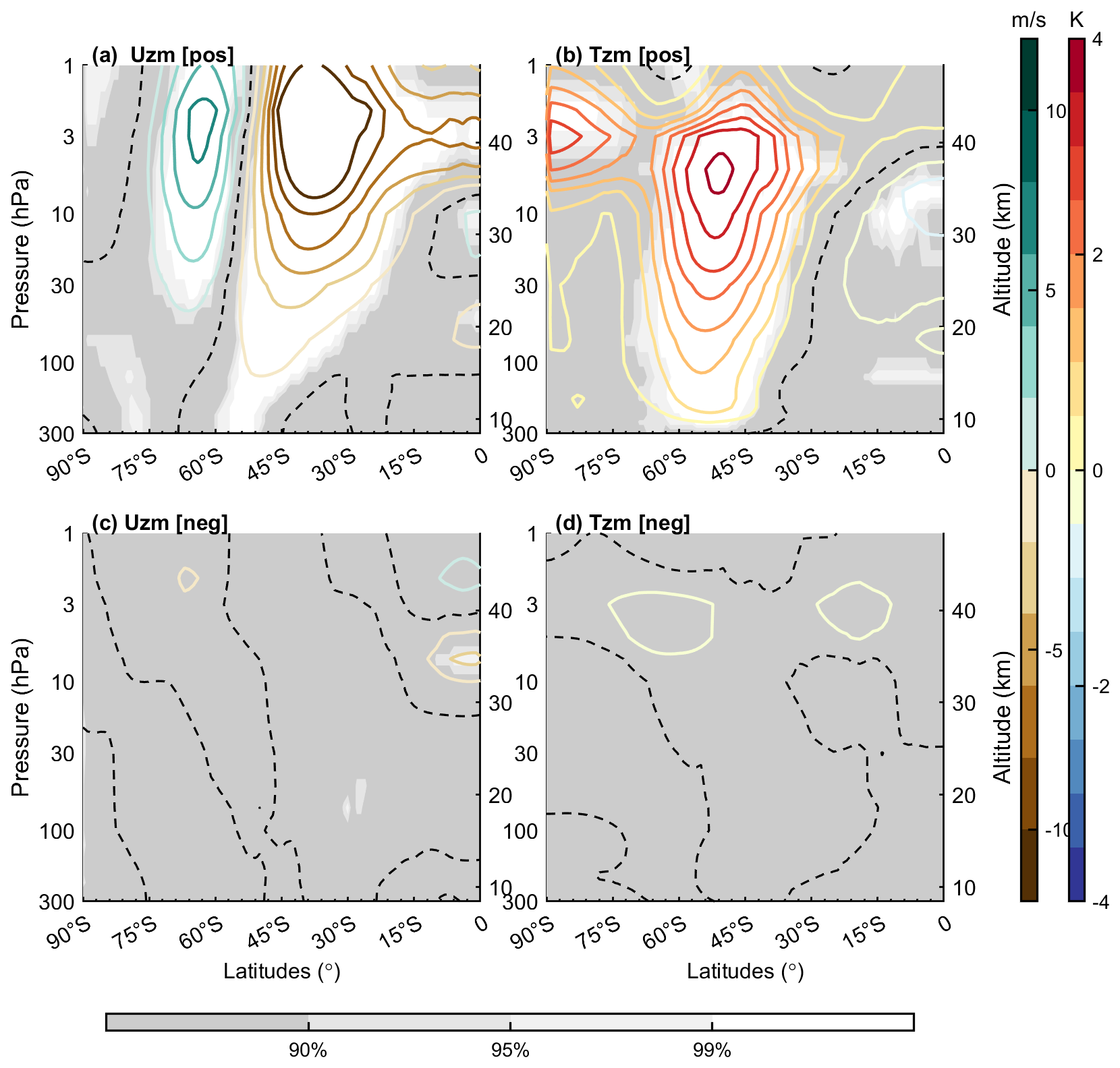 To investigate the impact of the MIOD on the SH stratosphere, composite analyses of zonal-mean temperature and wind fields were performed based on the identified positive and negative MIOD events. Figure 3 presents the austral winter (JJA) stratospheric zonal-mean temperature anomalies associated with positive and negative MIOD events. The composites exhibit a pronounced asymmetry between positive and negative MIOD events. During positive MIOD events (Fig. 3a and b), a strong negative anomaly in zonal wind appears in the midlatitude stratosphere, centered near 40° S at the stratopause level (∼ 1–3 hPa), with a minimum anomaly exceeding −18 m s−1. In contrast, the high-latitude stratosphere exhibits significant positive wind anomalies, centered around 65° S with peak values reaching approximately +8 m s−1. These zonal wind anomalies tilt poleward with decreasing altitude, as indicated by the zero-contour shifting from ∼ 50° S near the stratopause (1 hPa) to ∼ 70° S in the lower stratosphere (300 hPa). Over the equator, the upper and middle stratosphere exhibit a vertically alternating pattern, with negative anomalies (−5 m s−1) near 3 hPa, positive anomalies (+2 m s−1) around 10 hPa, and negative anomalies (∼ −2 m s−1) near 50 hPa. Accompanying these wind changes, significant warming is observed in the Southern Hemisphere stratosphere, forming a “T-shaped” structure. The primary warming appears in the midlatitudes and near the stratopause. A broad region of positive temperature anomalies (> 1 K) extends throughout the stratosphere (300–1 hPa), intensifying with height and reaching a maximum of over +4 K near 3–10 hPa. The meridional extent also broadens from 45–60° S in the lower stratosphere to 30–70° S near the stratopause. Additionally, another warming center is detected near the South Pole at ∼ 90° S and 3 hPa, with a peak of +4 K; however, no significant anomalies are present directly below this layer in the mid-stratosphere (> 3 hPa). The zonal wind and temperature anomalies (weakened midlatitude westerlies, strengthened high-latitude westerlies, and polar-cap warming) closely resemble the canonical negative phase of the Southern Annular Mode (SAM). For the negative MIOD events (Fig. 3c and d), the zonal-mean zonal wind and temperature anomalies are generally weak and fail to reach the 90 % confidence level based on the Monte Carlo significance test. Given the limited numbers of positive and negative MIOD events, the composites should be interpreted cautiously. Nevertheless, the overall structures of the atmospheric responses remain internally consistent across the identified events, supporting the robustness of the inferred positive–negative asymmetry within the available record. A brief examination of the adjacent seasons suggests that MIOD-related anomalies outside JJA are generally weak. No statistically significant signals are found in MAM, and only a marginal warm anomaly and slight vortex weakening appear in SON, reaching at most the 90 % confidence level. These features imply that the pronounced JJA response shows limited persistence into early spring, underscoring that winter remains the primary season of dynamically robust coupling.