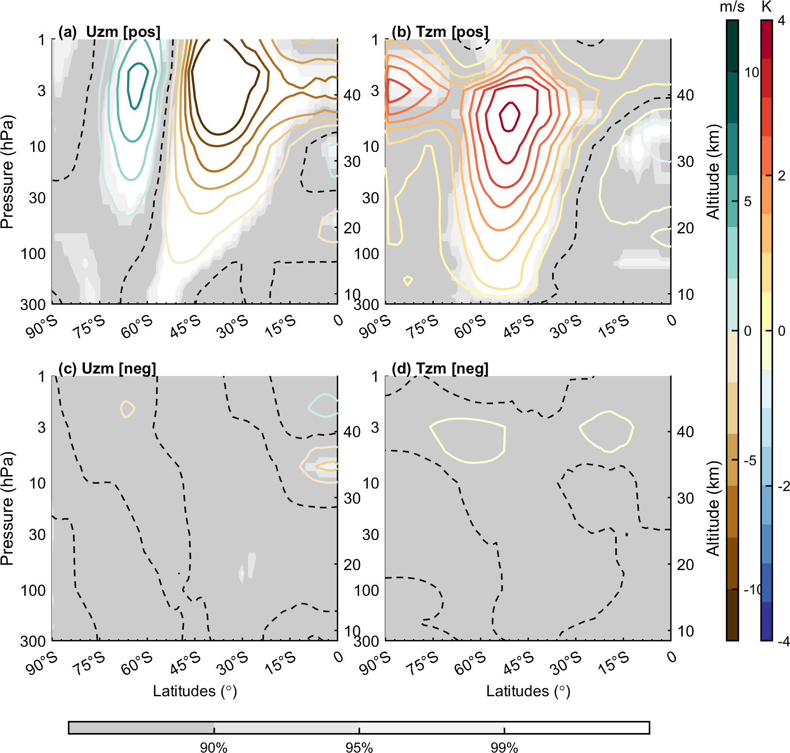 Figure 3(a) Composite zonal-mean zonal wind anomalies for positive MIOD events. Contours represent wind anomalies, with the dashed contour denoting the zero line. Shading indicates statistically significant regions based on a Monte Carlo test. (b) Same as panel (a), but for the zonal mean temperature anomalies. Panels (c) and (d), similar to panels (a) and (b) but for negative MIOD events.