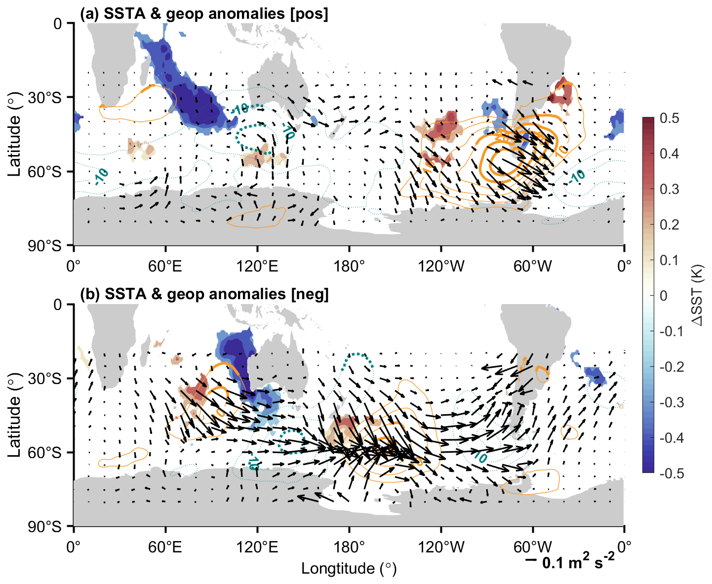 This asymmetry between positive and negative events may reflect differences in SST characteristics and atmospheric response mechanisms associated with opposite phases of the MIOD. To explore this further, Fig. 4 compares the spatial patterns of SST anomalies during positive and negative MIOD events. During positive-phase events (Fig. 4a), significant cold anomalies (∼ −0.4 K) are centered over the midlatitude central Indian Ocean, extending southeastward from east of Madagascar (30° S, 60° E) to approximately 45° S, 100° E. Concurrent warm anomalies are located south of Australia, with statistically significant values confined to the oceanic region between Australia and Antarctica. In contrast, negative-phase MIOD events (Fig. 4b) are characterized by a pronounced negative SST anomaly (−0.5 K) extending from south of the Maritime Continent toward the western coast of Australia, while warm anomalies are restricted to a relatively narrow region in the midlatitude central Indian Ocean.