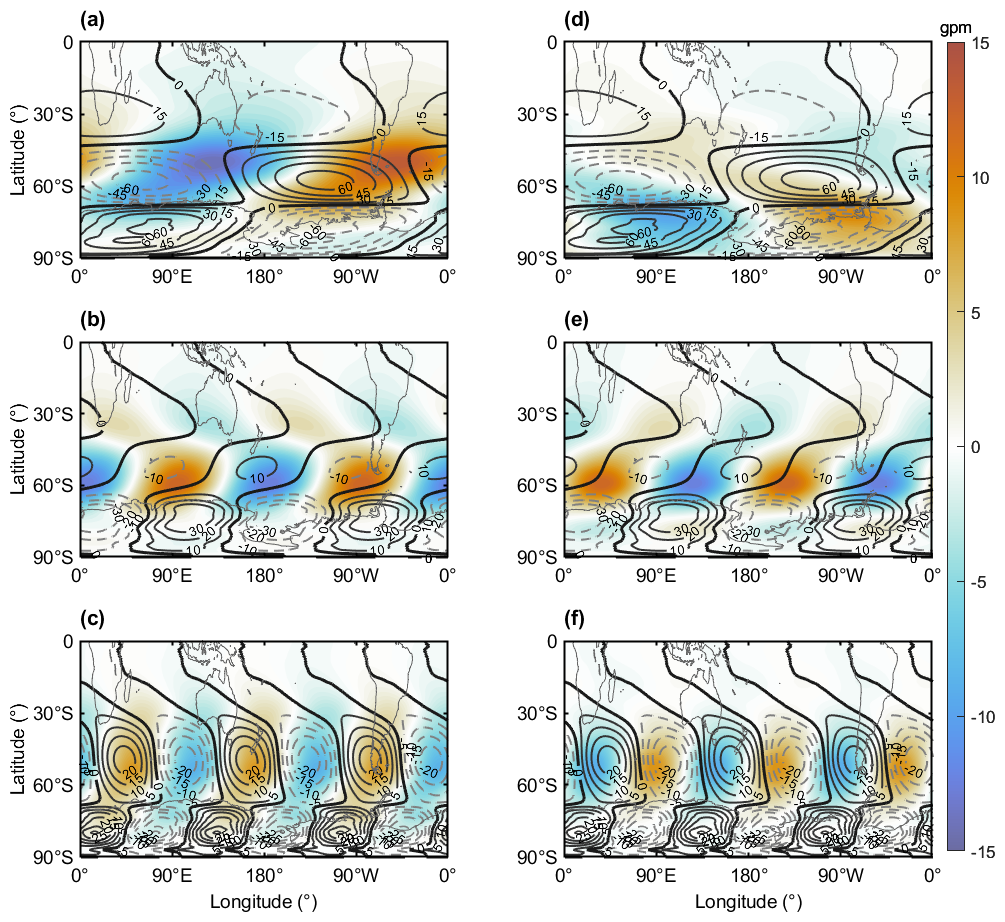 Figure 5Composite anomalies of 850 hPa geopotential height for different zonal wavenumber planetary wave components during Southern Hemisphere winter (June–August, JJA), overlaid with the long-term climatological mean. (a–c) Composite results for positive MIOD events for zonal wavenumbers 1, 2, and 3, respectively; panels (d)–(f) same as panels (a)–(c), but for negative MIOD events. Shading indicates geopotential height anomalies, and contours represent the climatological mean.