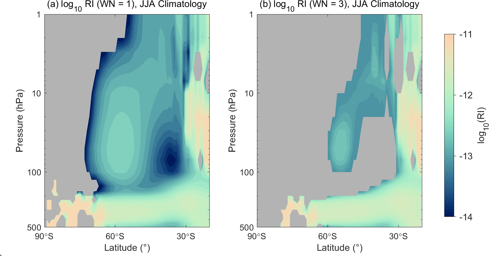 Figure 6June–July–August (JJA) climatological refractive index (RI) for (a) zonal wavenumber-1 (WN-1) and (b) zonal wavenumber-3 (WN-3), averaged over 1979–2020. Negative RI values are masked and shown in gray. The pressure axis is plotted on a logarithmic scale.