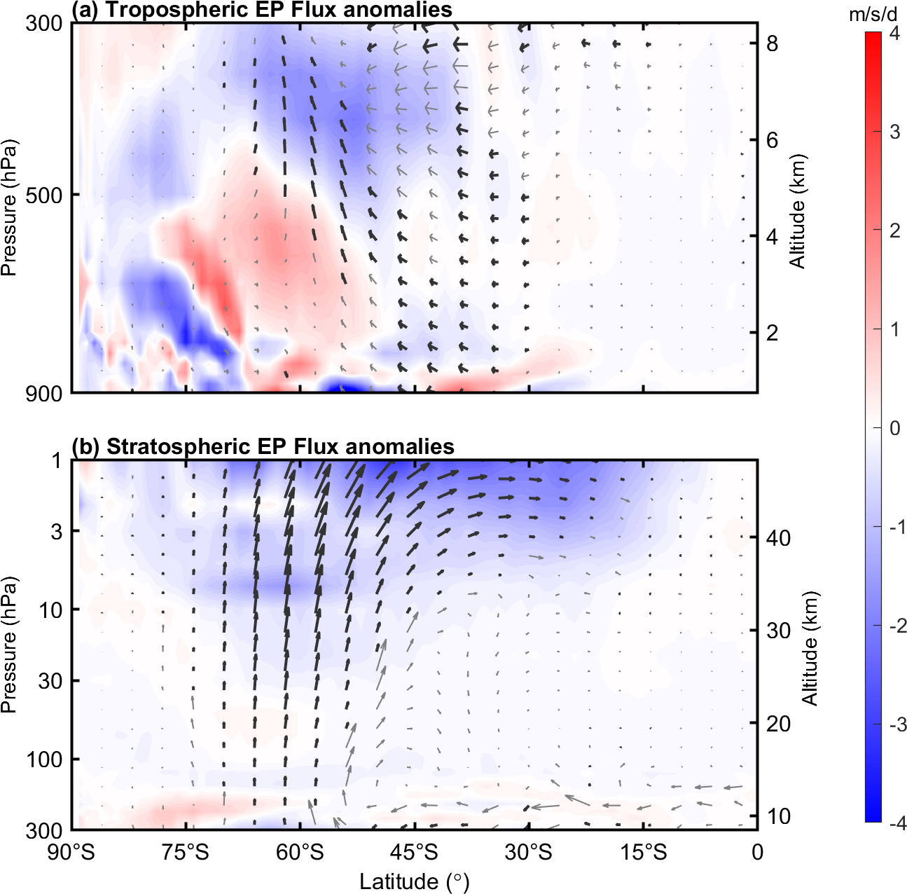 The positive temperature anomaly in the midlatitude stratosphere, centered near 50° S and ∼ 10 hPa (Fig. 3b), induces a marked meridional asymmetry in the temperature gradient () (Fig. 8a), with a strong negative gradient band (−11 K rad−1) between 30 and 50° S and a positive gradient over 50–75° S. According to the thermal wind relationship, this gradient structure drives a typical baroclinic response in the zonal thermal wind anomalies (Fig. 8b): the low-latitude negative gradient region forces a −20 m s−1 westerly anomaly centered near the stratopause and extending downward to 100 hPa, while the midlatitude positive gradient anomaly generates an eastward wind anomaly of up to +12 m s−1 at the stratopause, and the high-latitude negative gradient corresponds to a secondary −3.4 m s−1 anomaly. This thermal wind framework explains the dipolar structure of the zonal wind anomalies in Fig. 3, including the high-latitude reversal to positive anomalies. The smaller amplitude of the observed anomalies compared to the calculated thermal wind (e.g., +8 m s−1 vs. +12 m s−1 in mid-to-high latitudes) is partially attributed to planetary wave breaking, as indicated by the EP flux divergence (∼ −2 at 60° S, 1 hPa), which acts to weaken the thermal-wind-driven response.