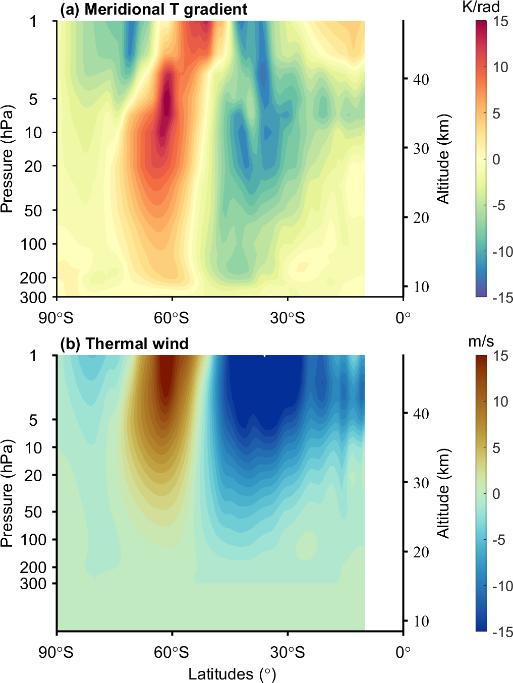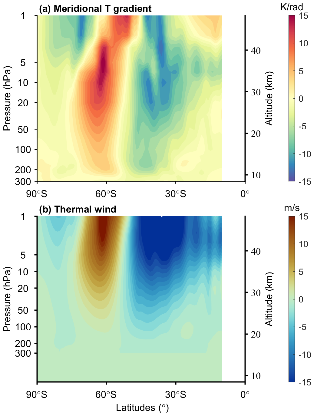 However, besides the negative zonal-mean zonal wind anomalies over the midlatitudes (30–50° S) shown in Fig. 3, a region of positive anomalies is also present over high latitudes (60–75° S) near 3 hPa. This high-latitude response may be linked to the dynamical adjustment associated with the midlatitude wind anomalies. Under the quasi-geostrophic and hydrostatic balance approximation, the zonal wind can be approximated by the thermal wind (Andrews et al., 1987), with both the climatological mean temperature (T) and zonal wind (U) satisfying the thermal wind equation. Accordingly, the zonal thermal wind anomaly () and the meridional gradient of the temperature anomaly (T′) satisfy: