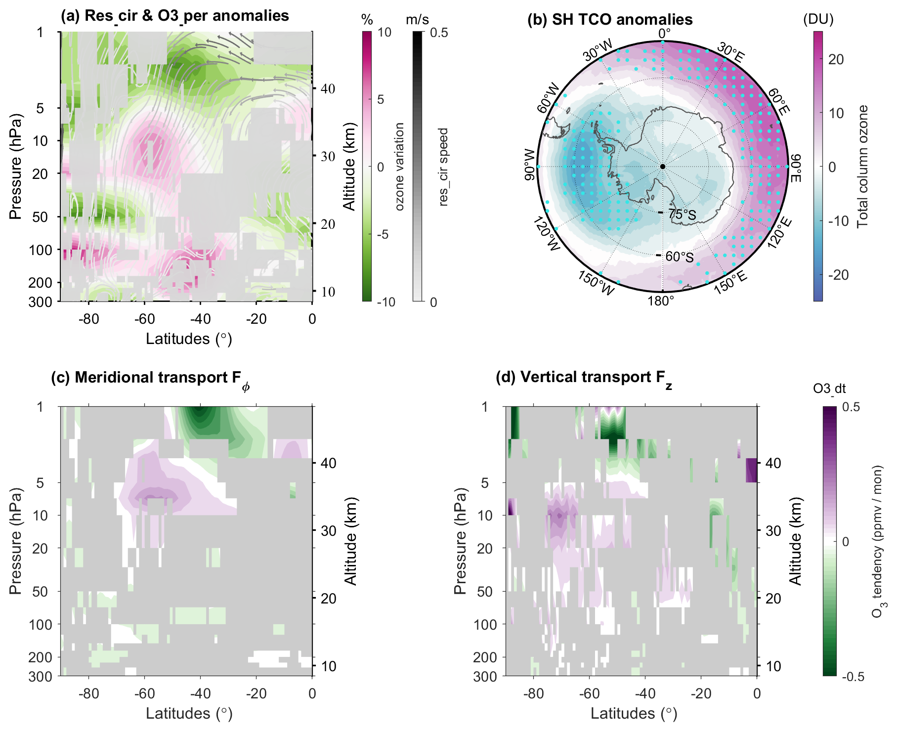 Figure 10(a) Composite ozone mixing ratio percentage anomalies and residual circulation anomalies (, ) during positive MIOD events (JJA). Gray shading denotes regions where residual circulation anomalies are not significant at the 90 % level. (b) Composite total column ozone anomalies for positive MIOD events (JJA), with stippling indicating significance at the 90 % level. (c) Composite anomalies of the meridional transport term (Fϕ). Gray shading marks regions not significant at the 90 % level. (d) Same as panel (c), but for the vertical transport term (Fz).