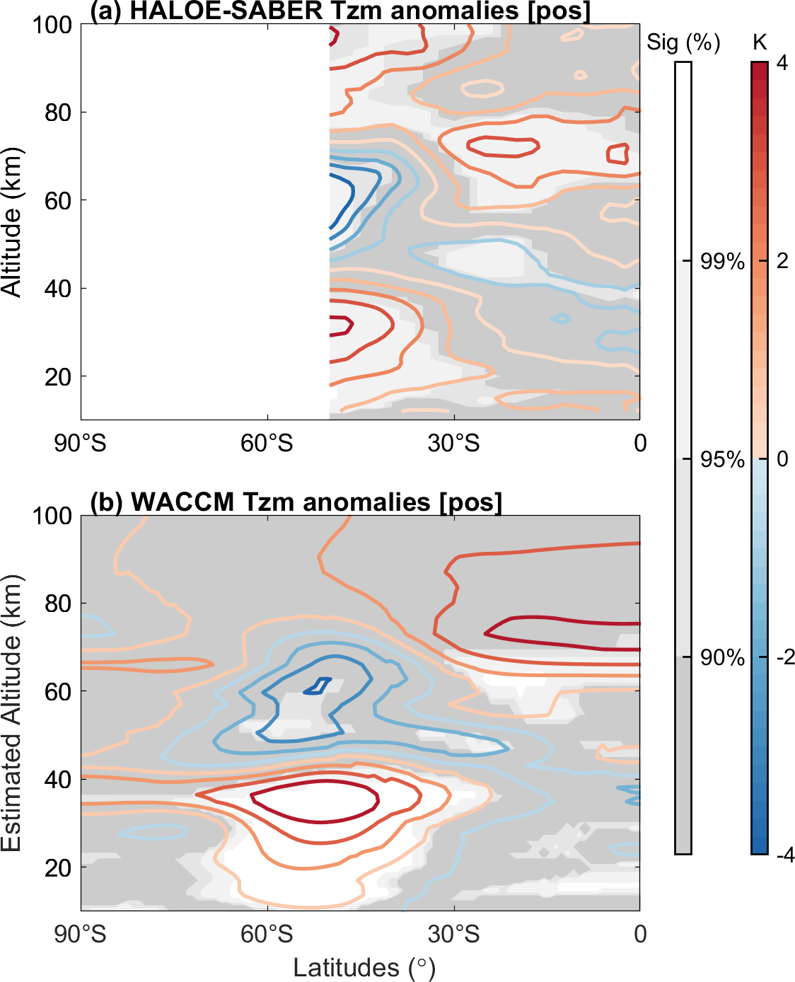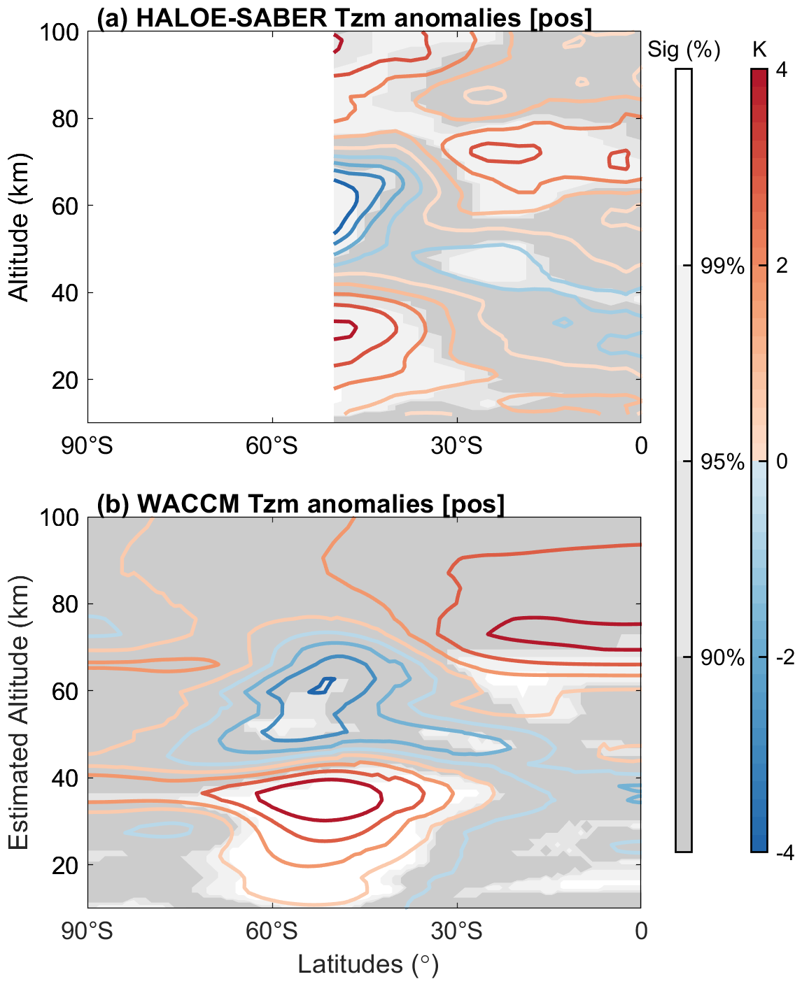 We use merged HALOE–SABER temperature observations (10–100 km) for 1991–2022, restricted to 55° S–equator owing to data gaps poleward of 50° S in HALOE and limited coverage south of 55° S in SABER. Figure 11a shows composite zonal-mean temperature anomalies for positive MIOD events from merged HALOE-SABER observations (1991–2022), and Fig. 11b shows the corresponding composite constructed from SD-WACCM6 outputs.