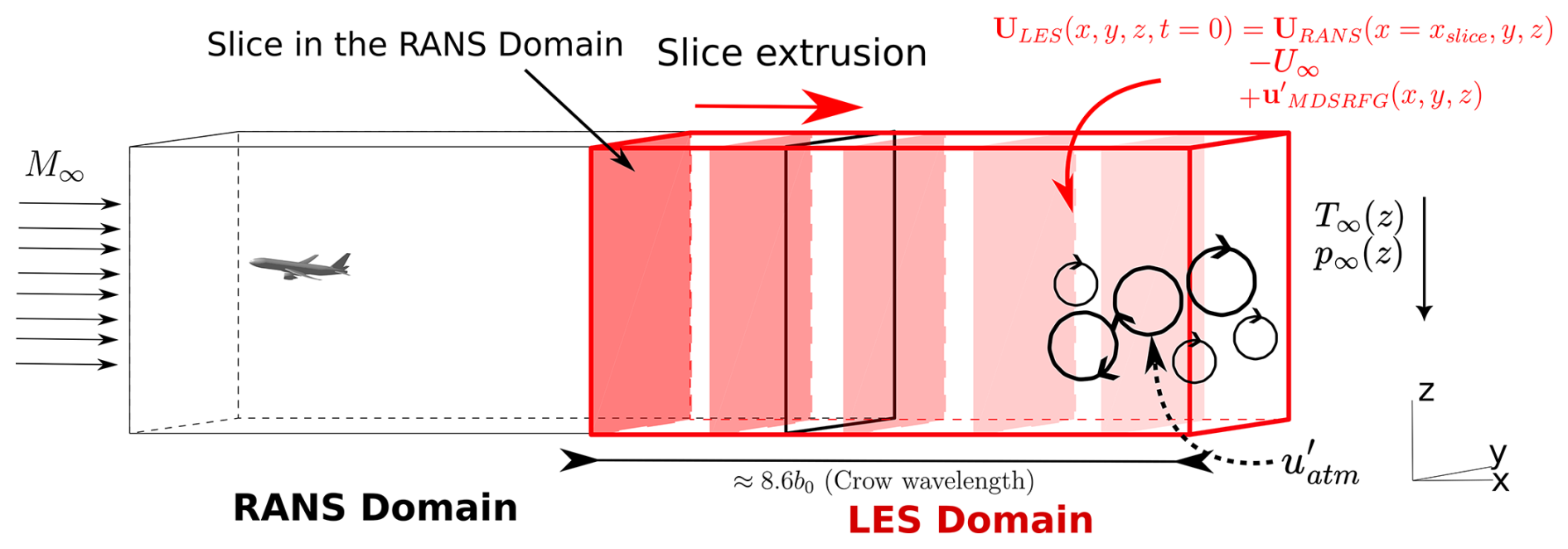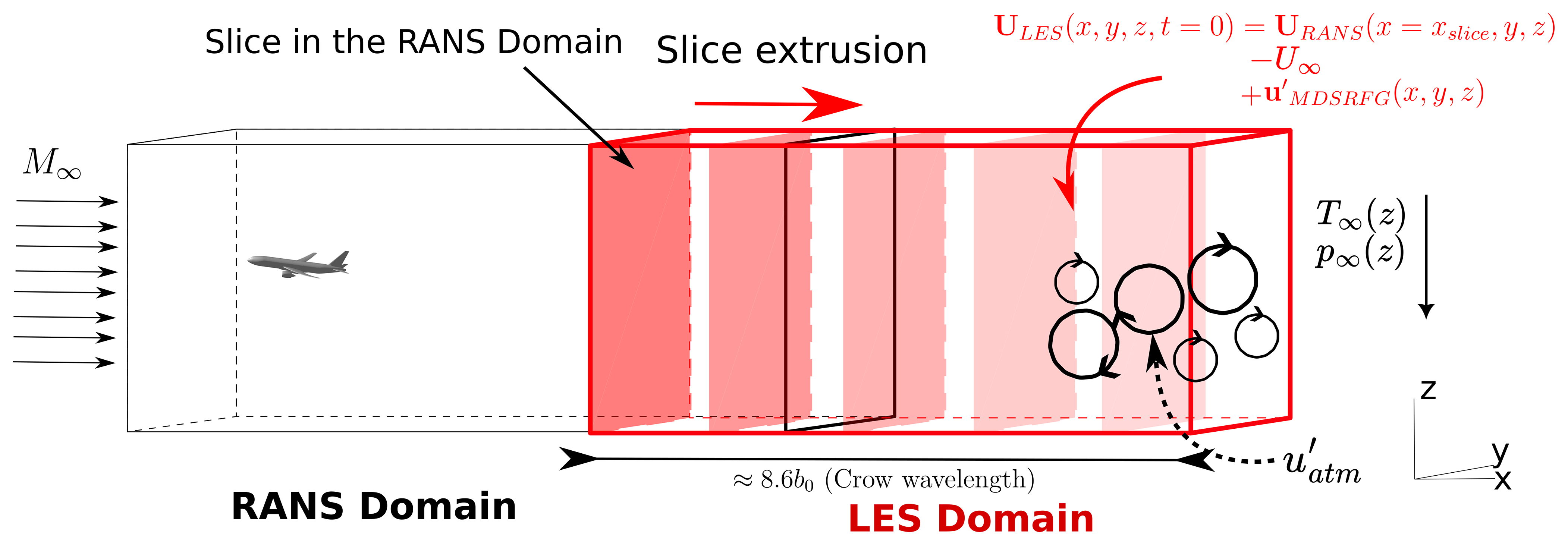 In order to transfer the information from RANS turbulence-related fields (Reynolds tensor, dissipation rate) to the LES domain, synthetic turbulence fluctuations noted uMDSRFG are generated using the MDSRFG method developed in Castro and Paz (2013) and added inside the plume, which is defined for a given position x by the isosurface Ux>12(Uj+U) with Uj the maximum axial velocity in the plume and U the flight speed. Another synthetic turbulence fluctuation field uatm is generated in the entirety of the LES domain using the MDSRFG method. This fluctuation field aims to model atmospheric turbulence responsible for the vortices destruction. The mathematical formulation of the synthetic turbulence is fully described in Bouhafid et al. (2024). Finally, stratification is taken into account by including the effect of gravity in the LES and allowing both ambient static temperature and ambient static pressure to vary with altitude z for a given Brunt-Väisälä frequency Nb.