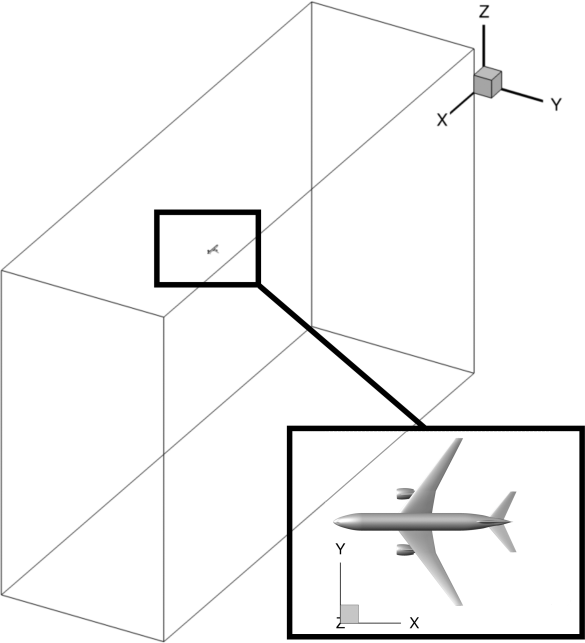 The RANS domain is the same as the one in Bouhafid et al. (2024) and consists of the B777-like CRM geometry inside a box. In terms of design parameters for the CRM geometry, wingspan b is 58.8 m, wing area S is 383 m2, and mean chord cm is 6.5 m. The box dimensions are Lx×Ly×Lz with Lx=30b, Ly=20b and Lz=20b as illustrated in Fig. 2.