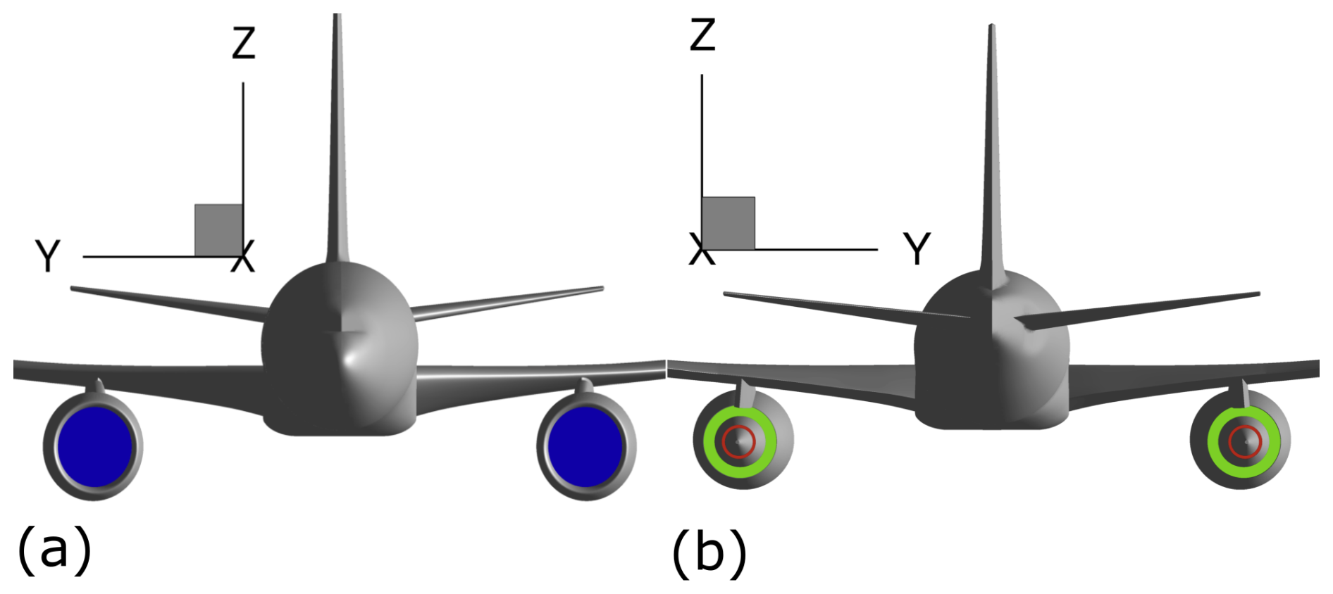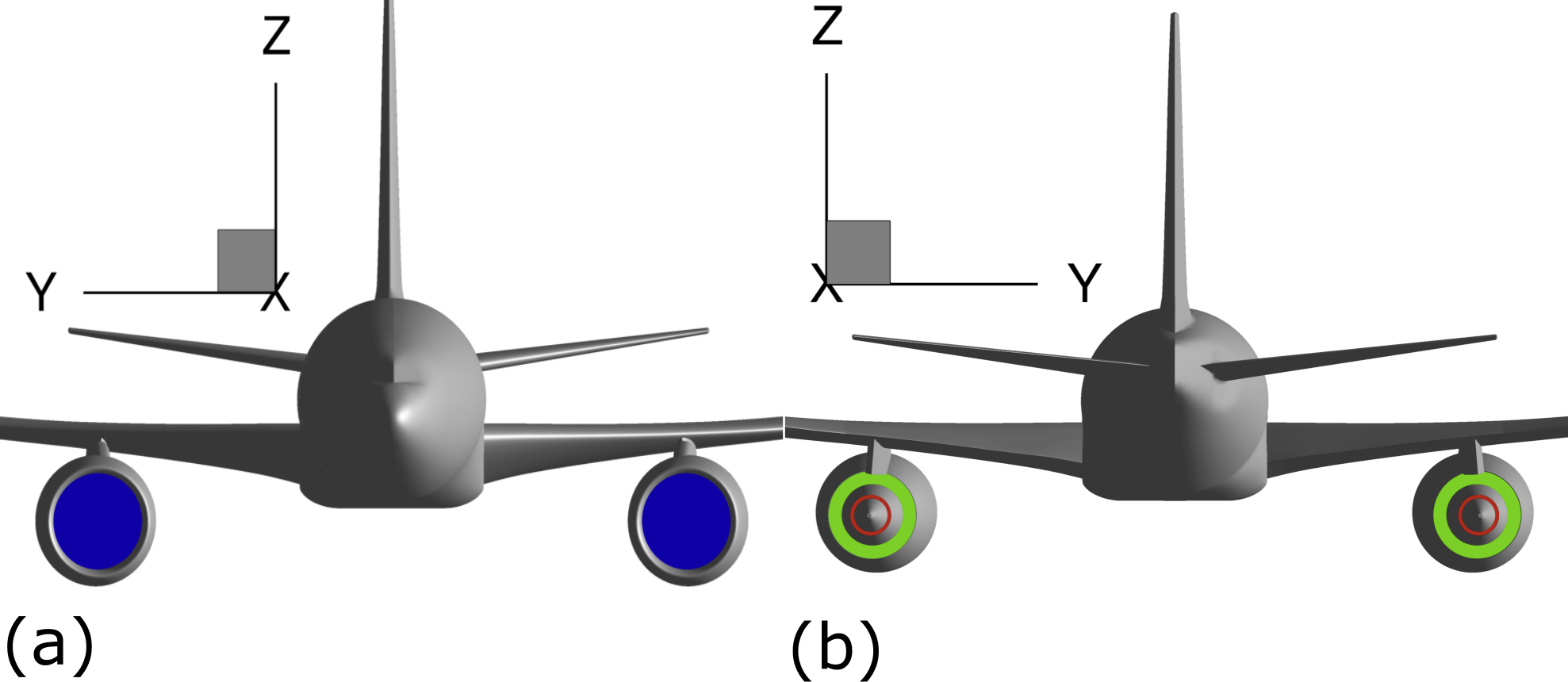 Figure 3CRM geometry with jet engines. (a) Engine inlet. (b) Core engine outlet & Bypass engine outlet.