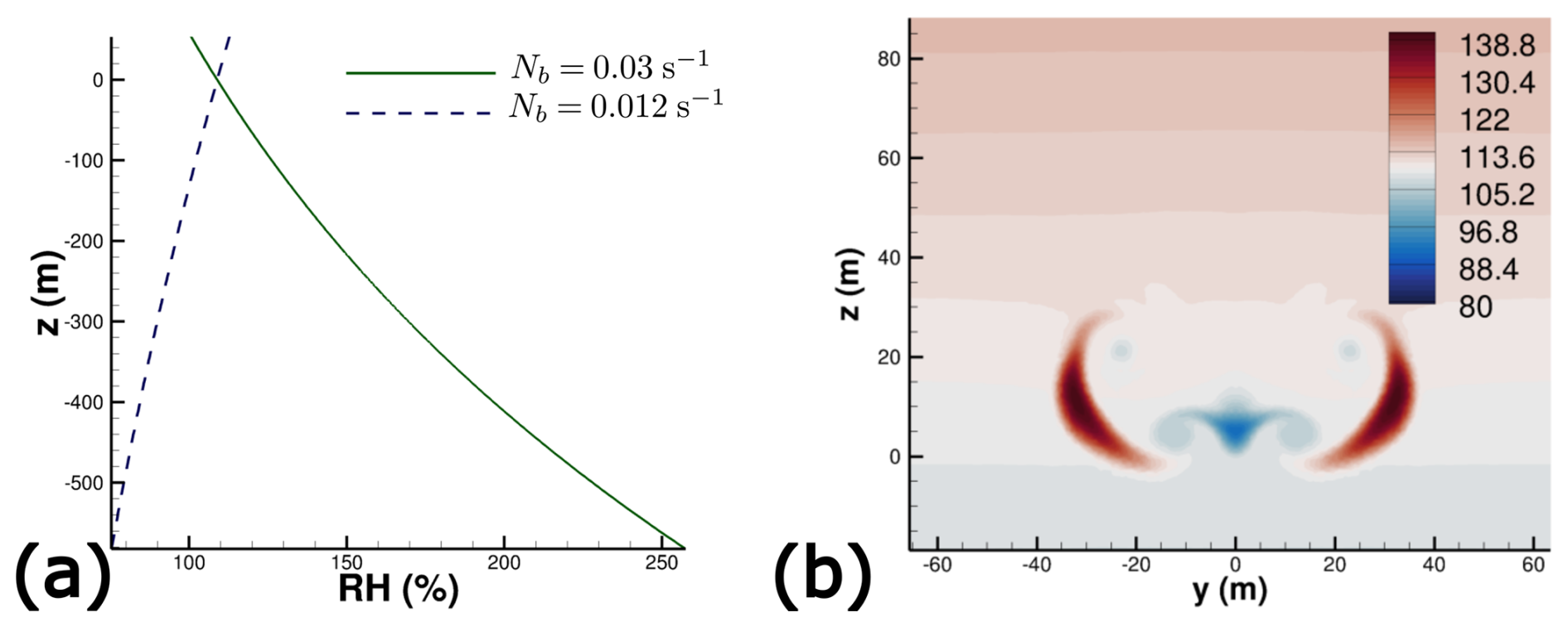 Figure 5(a) Evolution of RHice(z) in the LES domain and (b) RHice field in the plume for Nb=0.012 s−1 at t=0.