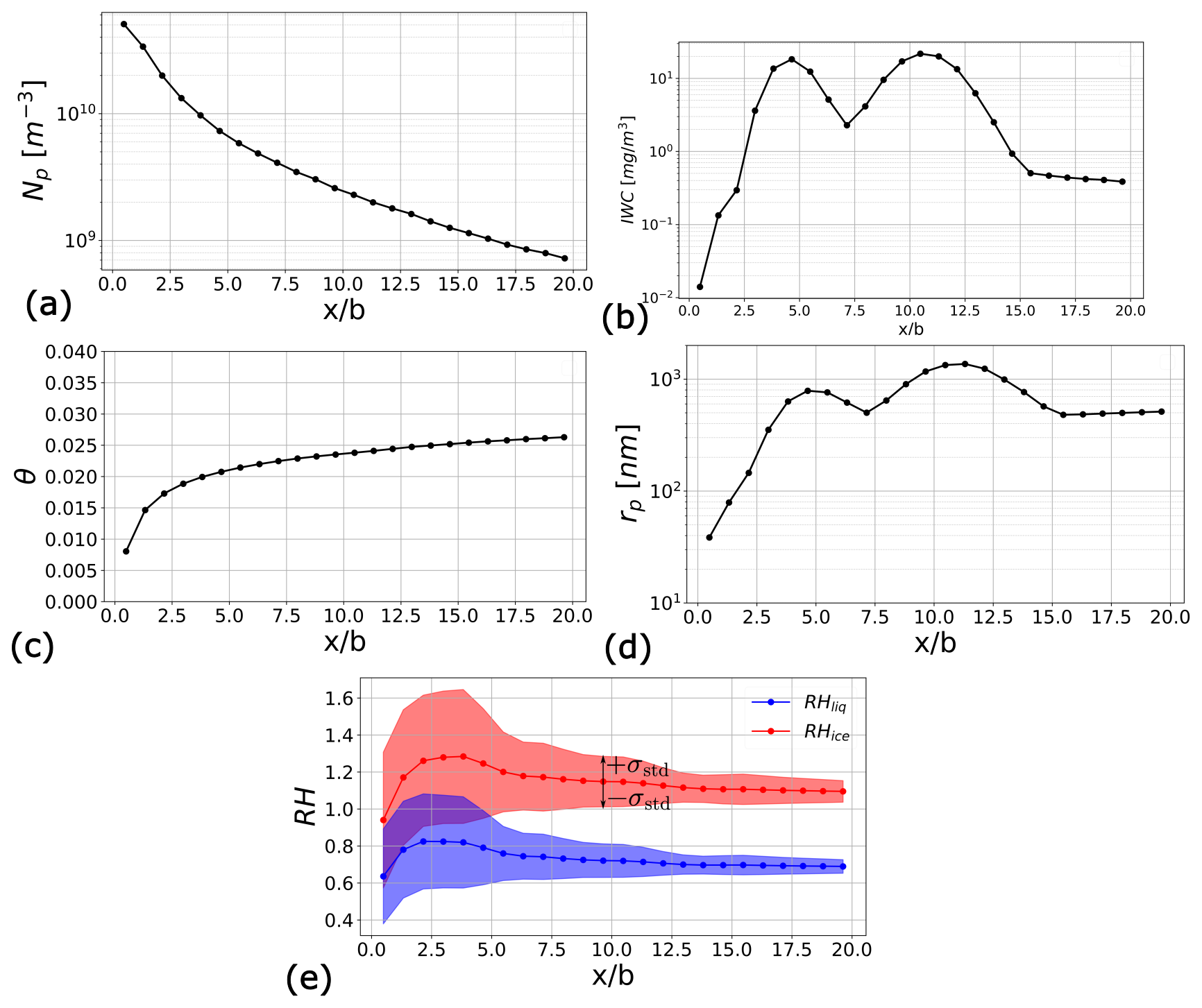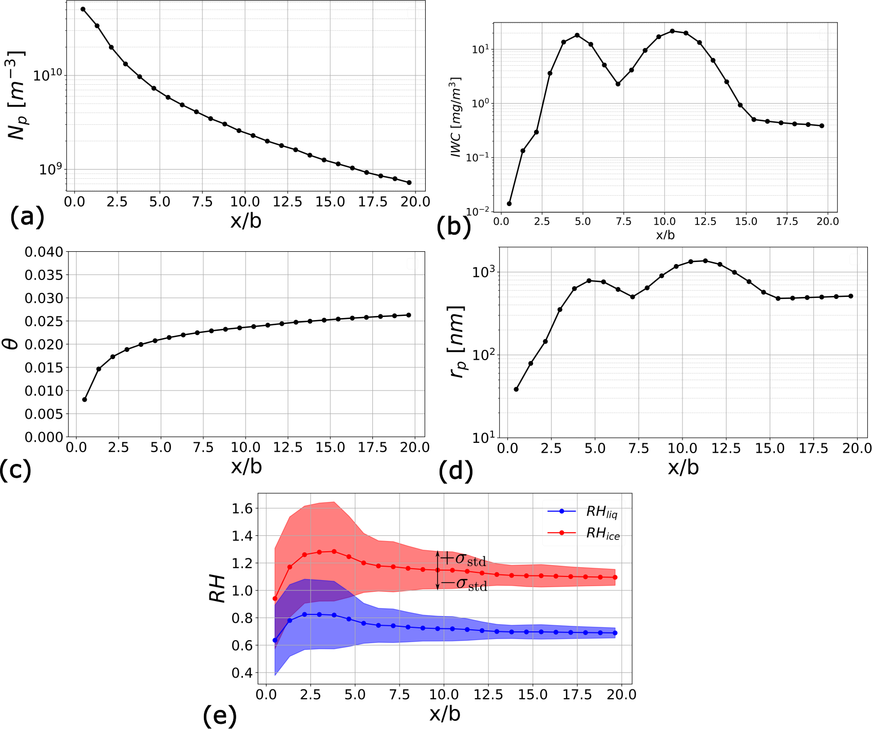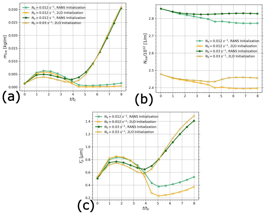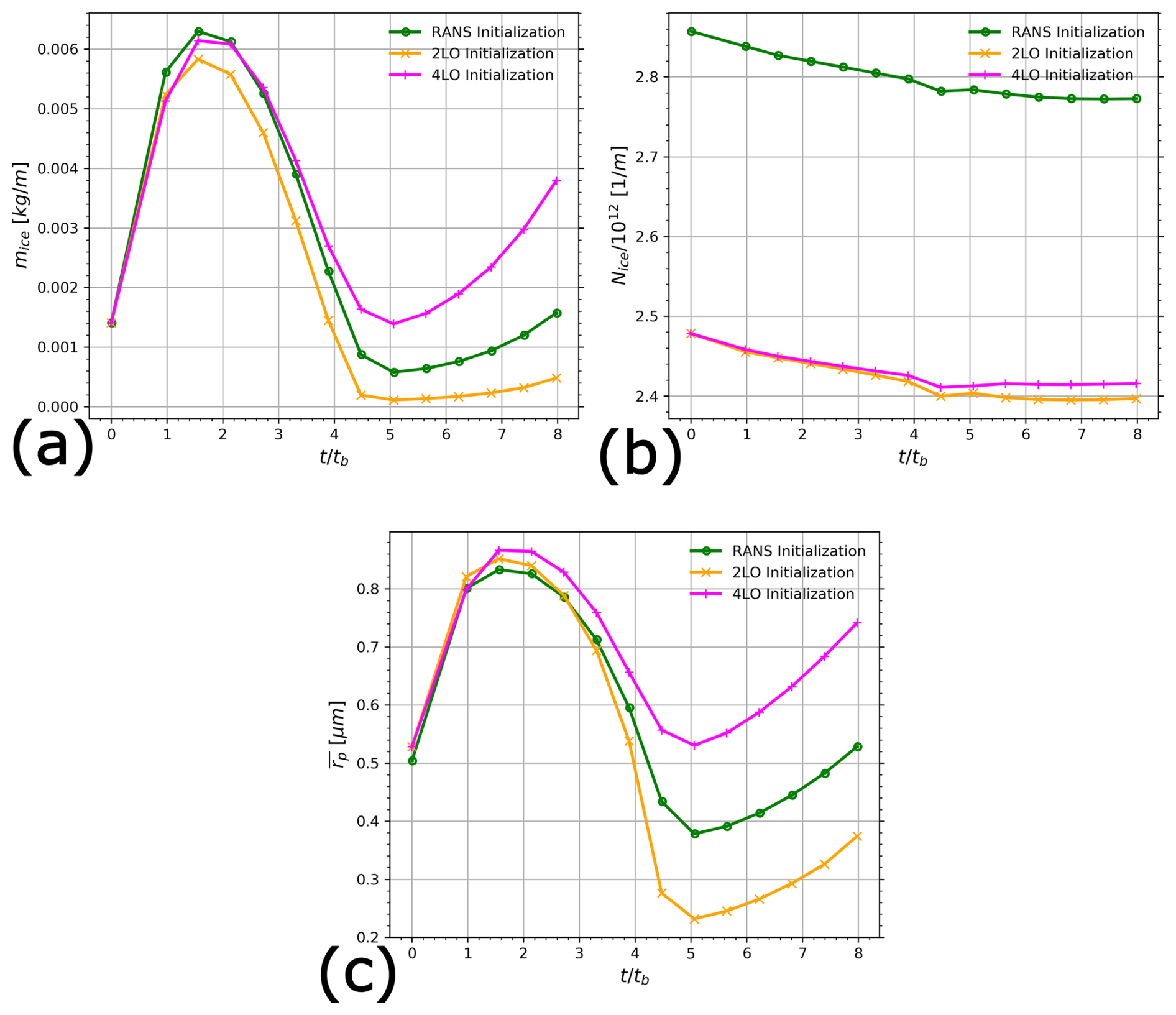The evolution of total microphysical quantities is plotted in Fig. 21. The addition of the two HTP vortices in the analytical initialization strategy gives very similar results to the RANS initialization in terms of mice until t/tb3.25. At the end of the simulation, the 4LO initialization strategy gives the highest ice mass. More precisely, the contrail obtained with the 4LO initialization is approximately six times heavier than the one obtained through RANS initialization. As the total ice crystal number per meter of flightpath Nice is very similar between the 2LO and 4LO initializations as observed in Fig. 21b, the difference in ice mass results in larger ice crystals for the 4LO initialization. At the end of the LES simulation, ice crystals in the 4LO initialization are, on average, almost twice as large as those in the 2LO initialization, despite identical initial ice mass and total ice crystal number.