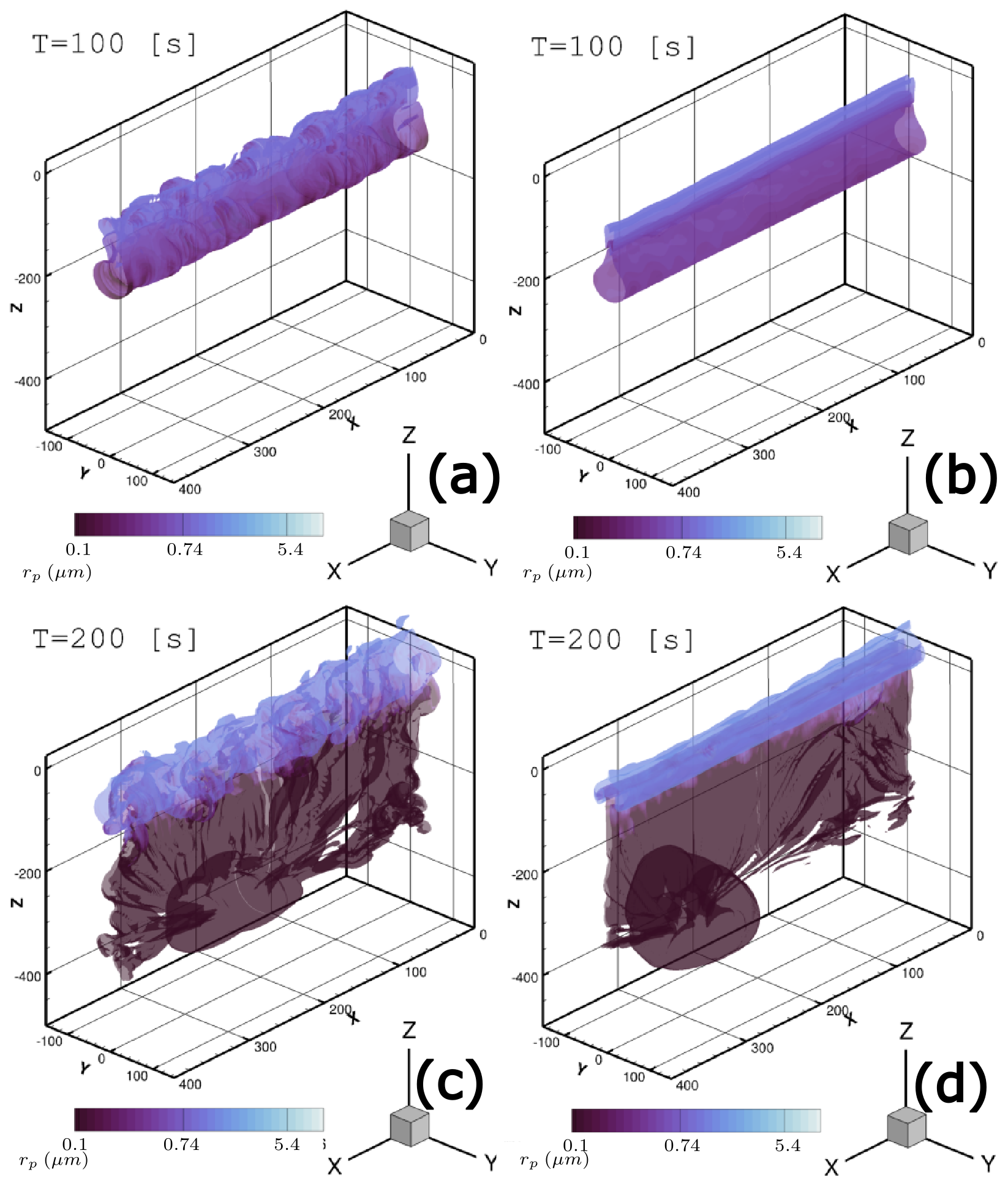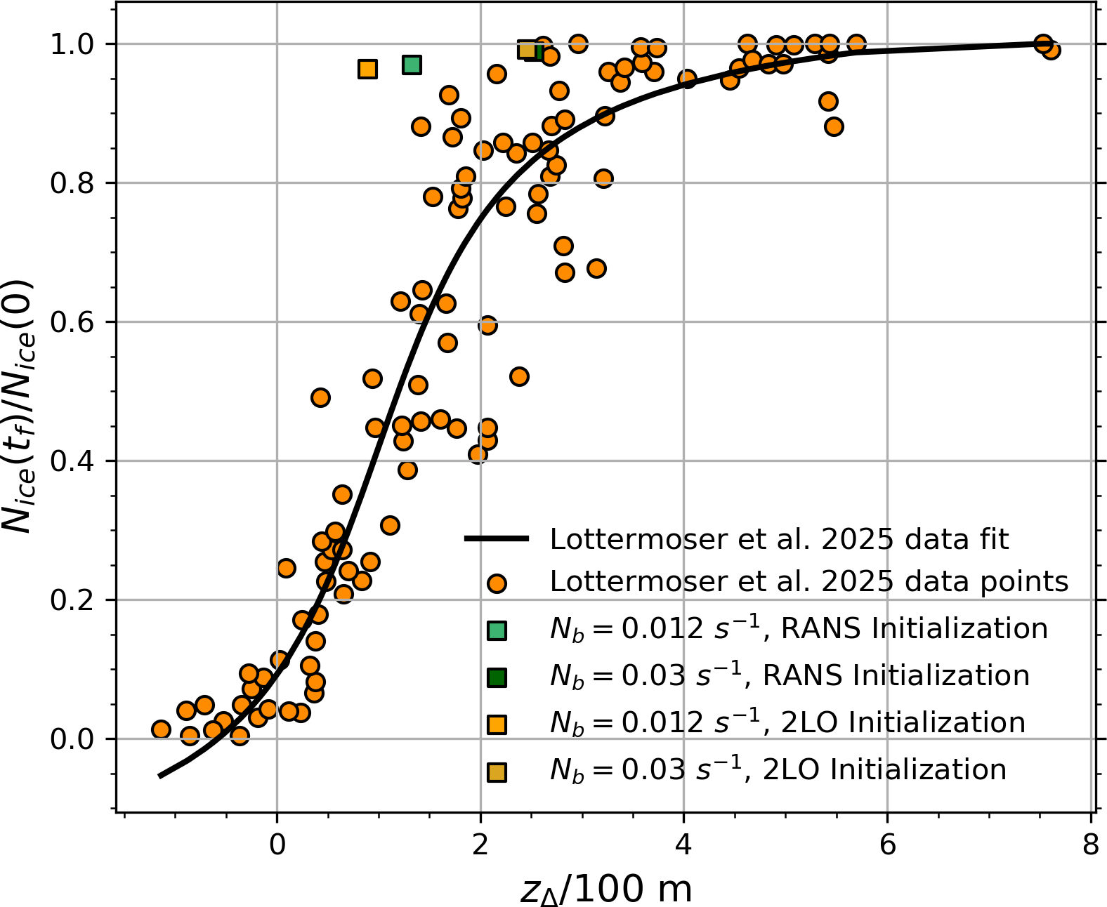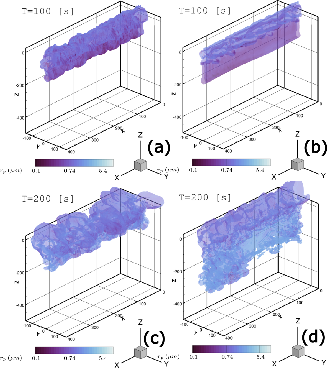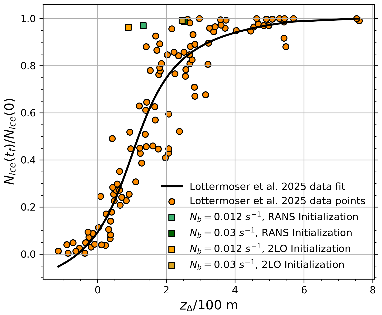 The evolution of total microphysical quantities is plotted in Fig. 21. The addition of the two HTP vortices in the analytical initialization strategy gives very similar results to the RANS initialization in terms of mice until t/tb3.25. At the end of the simulation, the 4LO initialization strategy gives the highest ice mass. More precisely, the contrail obtained with the 4LO initialization is approximately six times heavier than the one obtained through RANS initialization. As the total ice crystal number per meter of flightpath Nice is very similar between the 2LO and 4LO initializations as observed in Fig. 21b, the difference in ice mass results in larger ice crystals for the 4LO initialization. At the end of the LES simulation, ice crystals in the 4LO initialization are, on average, almost twice as large as those in the 2LO initialization, despite identical initial ice mass and total ice crystal number.