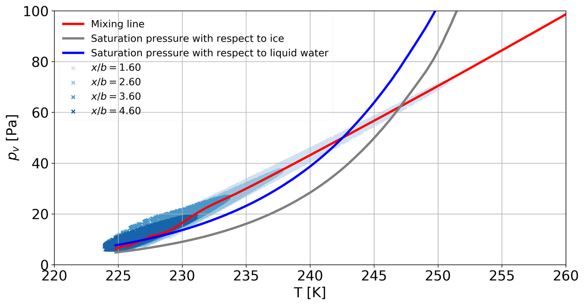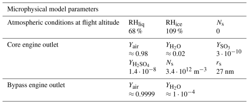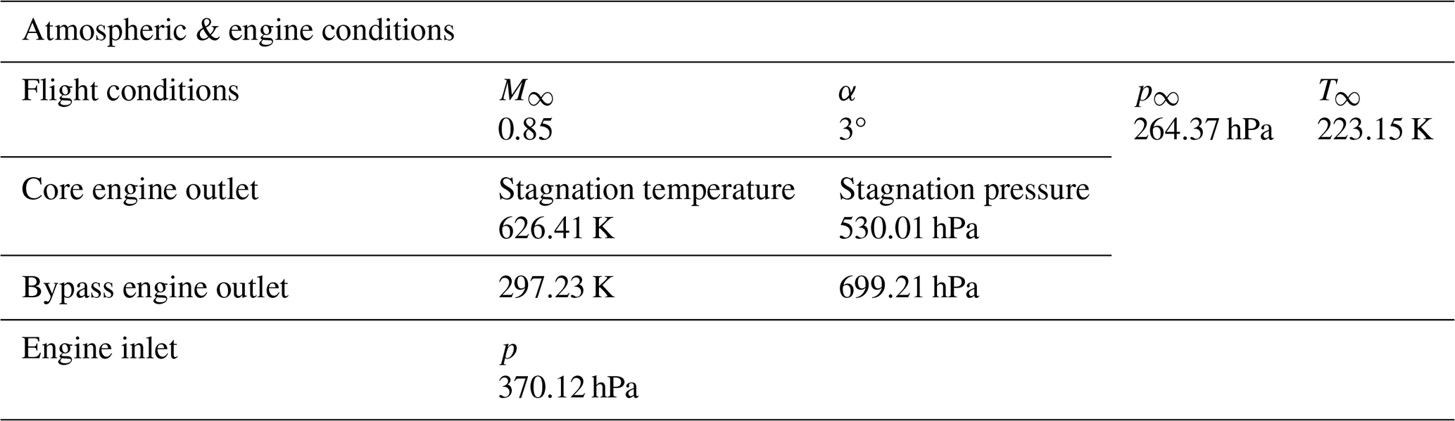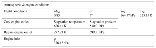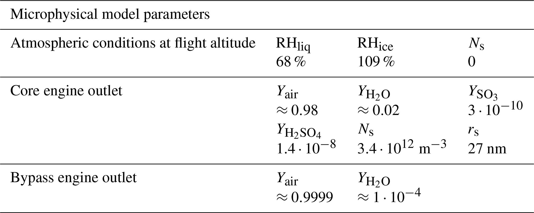 The contrail is studied for cruise flight conditions with a flight Mach number M=0.85 and an angle of attack α=3° (see Table 1). The ambient static pressure p and ambient static temperature T are typical for an altitude of 11 km inside the troposphere. The effect of stratification can be neglected in the jet regime and is thus not taken into account in the RANS calculation. Ambient water vapor mass fraction was chosen to impose RHice=109 % and RHliq=68 % (see Table 2), with RHice and RHliq being respectively the ambient relative humidity with respect to ice and the ambient relative humidity with respect to liquid water.