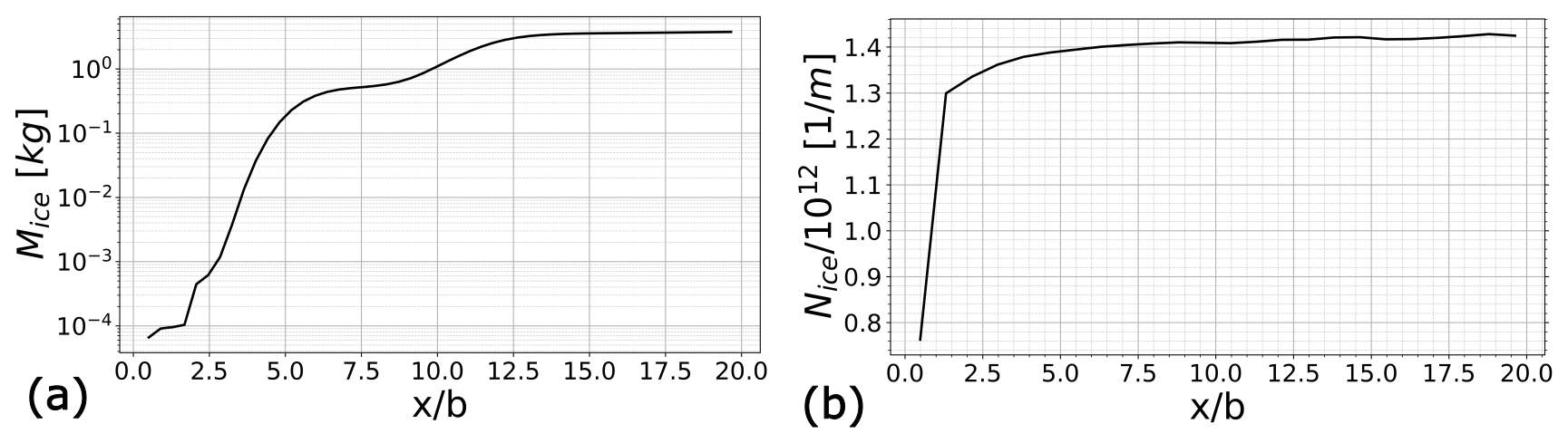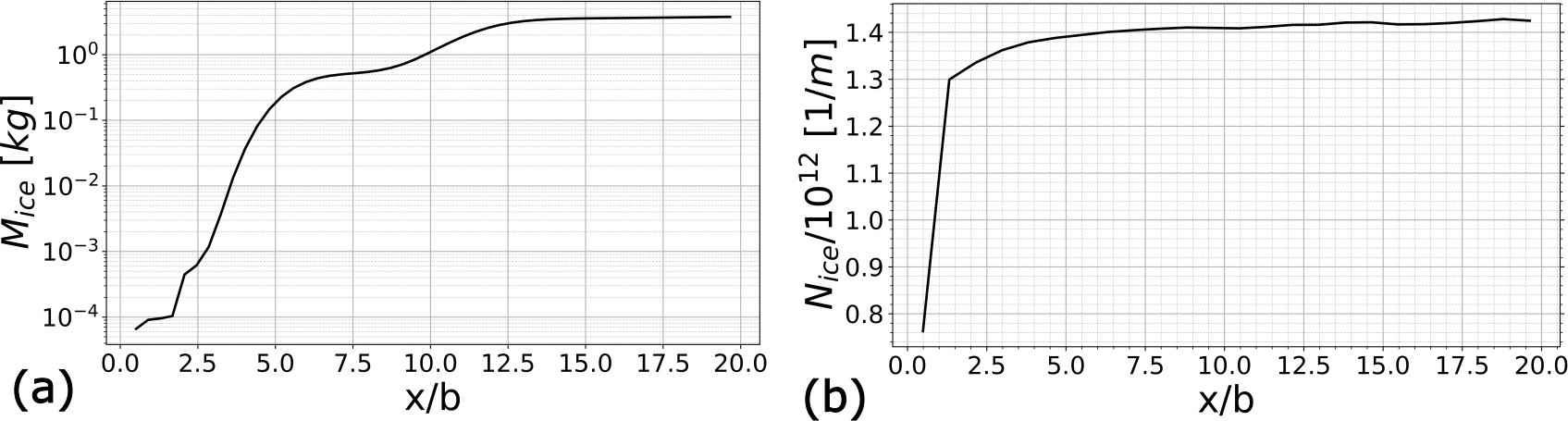 Contrail ice is modeled by introducing a new species, H2Os, representing water in the solid phase formed through heterogeneous nucleation of water vapor on activated soot. More precisely, activated soot particles serve as condensation nuclei. Water vapor diffuses onto these particles and forms an ice cap if the ambient air is supersaturated with respect to liquid water. As stated above, the model assumes that freezing happens instantly once liquid water forms on the soot particle. Currently, the microphysical model makes the simplifying assumption that all the ice spreads evenly over the soot particle surface, creating spherical ice crystals. These newly formed ice crystals then continue to grow by condensation as long as the relative humidity with respect to ice exceeds 100 %. The transformation of water vapor to ice and vice-versa is modeled through the reaction H2O↔H2Os. The source term ω˙ice, representing the mass production rate of ice crystals due to water vapor deposition around soot particles, is given by: