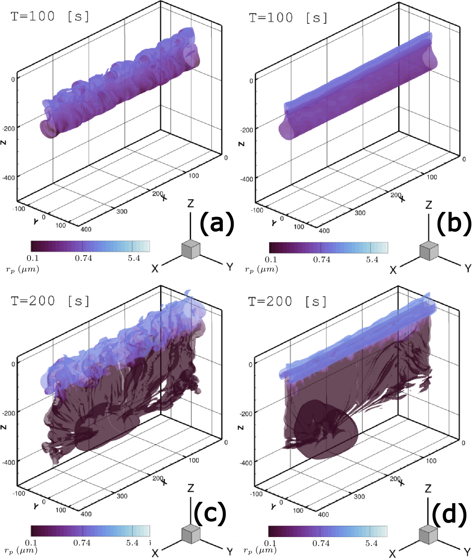 where ρ is the density of the gas mixture, ρsol is the density of ice – not to be confused with ρH2Os=ρYH2Os the density of the H2Os species in the gas mixture which corresponds to ice water content – , and rs=12Ds is the radius of a dry soot particle. The saturation vapor pressures with respect to liquid water and ice are given by the semi-empirical formulas from Murphy and Koop (2005) and the density ρsol is given by Tabazadeh et al. (2000). Therefore, in this model, every particle with rp>rs can be considered to be an ice crystal as it necessarily implies that YH2Os>0. Conversely, rp=rs means that the particle is a dry soot particle.