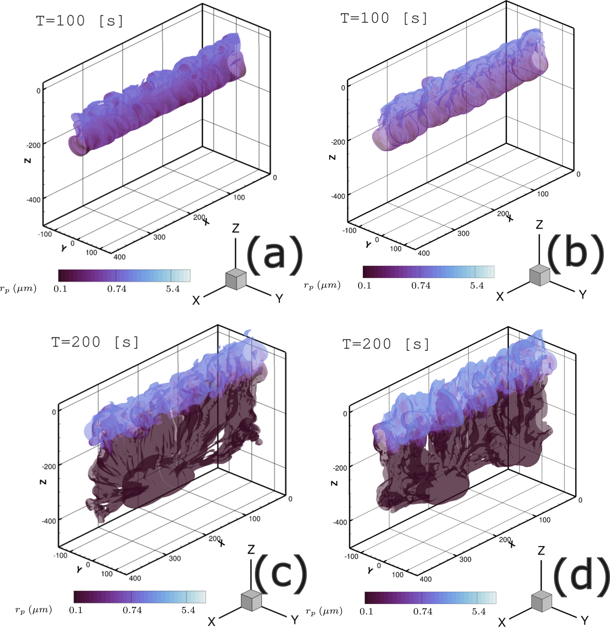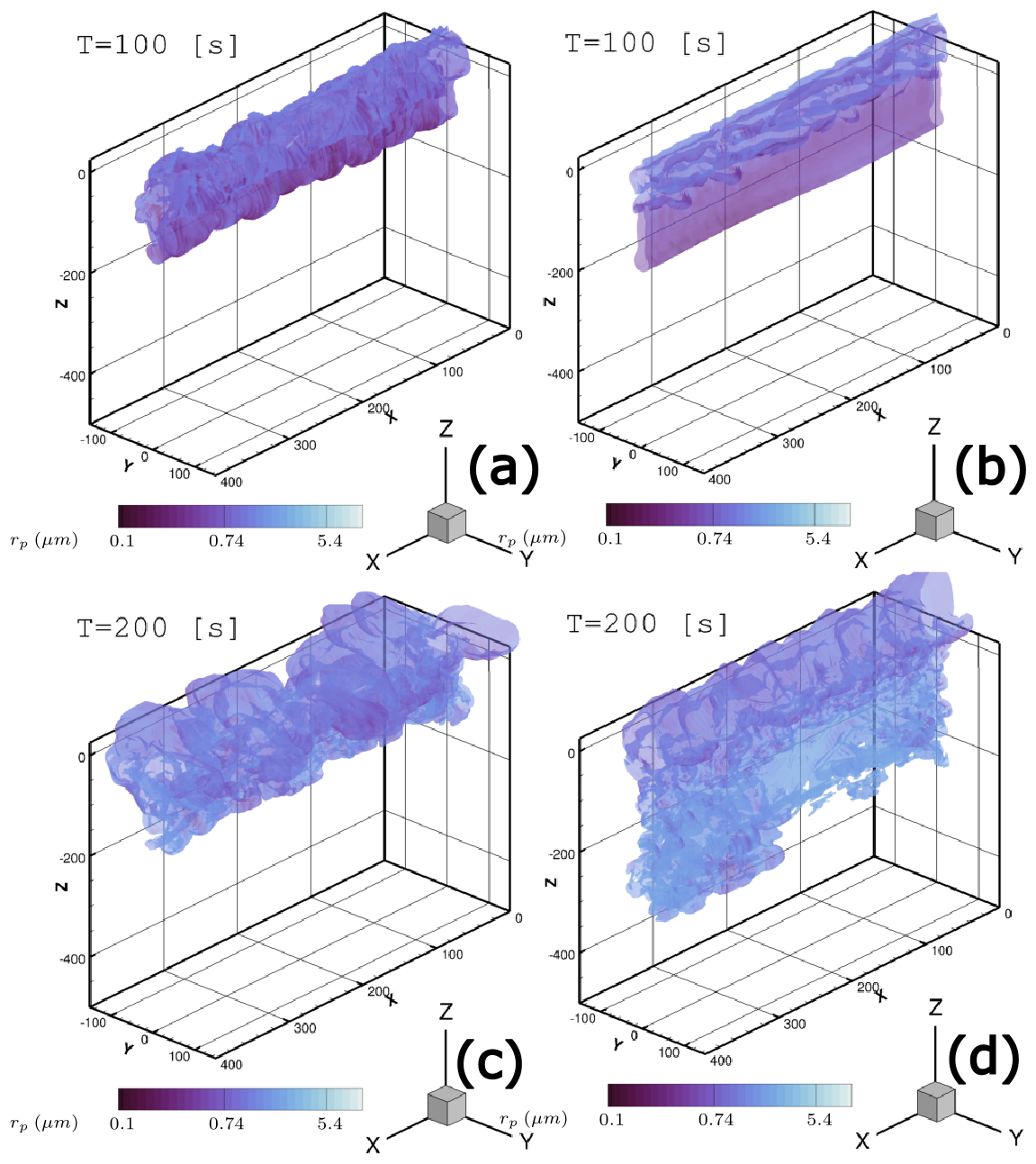 The formation and evolution of contrails can be divided into four successive regimes (see Gerz et al.1998; Paoli et al.2013; Misaka et al.2015; Jacquin and Garnier1996), each governed by specific physical phenomena. The jet regime, lasting only a few seconds (see Jacquin and Garnier1996), is dominated by strong turbulent diffusion in the engine jet while the wing's vortex sheet rolls into a pair of counter-rotating wingtip vortices. As the jet plume cools down, ice crystals begin to form, making the contrail visible at about one to two wingspans behind the aircraft (see Khou et al.2015; Ramsay et al.2024). In the case of soot-rich emissions, that is to say for a soot emission index greater than 5×1014 kg−1 as stated in Yu et al. (2024), ice crystals primarily form through the condensation of water vapor onto soot particles. Conversely, if soot concentration is low in the plume, ice crystals predominantly form on volatile particles that have formed earlier in the plume, such as sulfuric acid droplets (see Kärcher1998). Interaction between the jet and vortices becomes significant around ten wingspans for a typical airliner and can be quantified by looking at the R3 ratio defined in Jacquin and Garnier (1996).