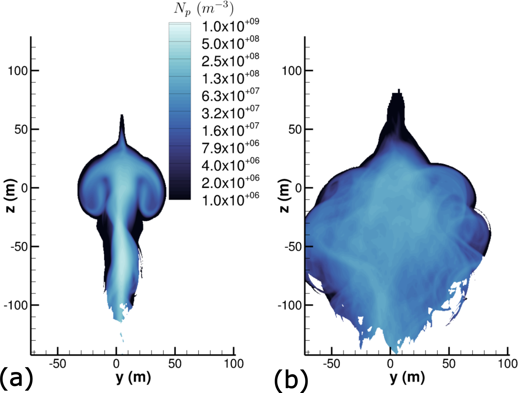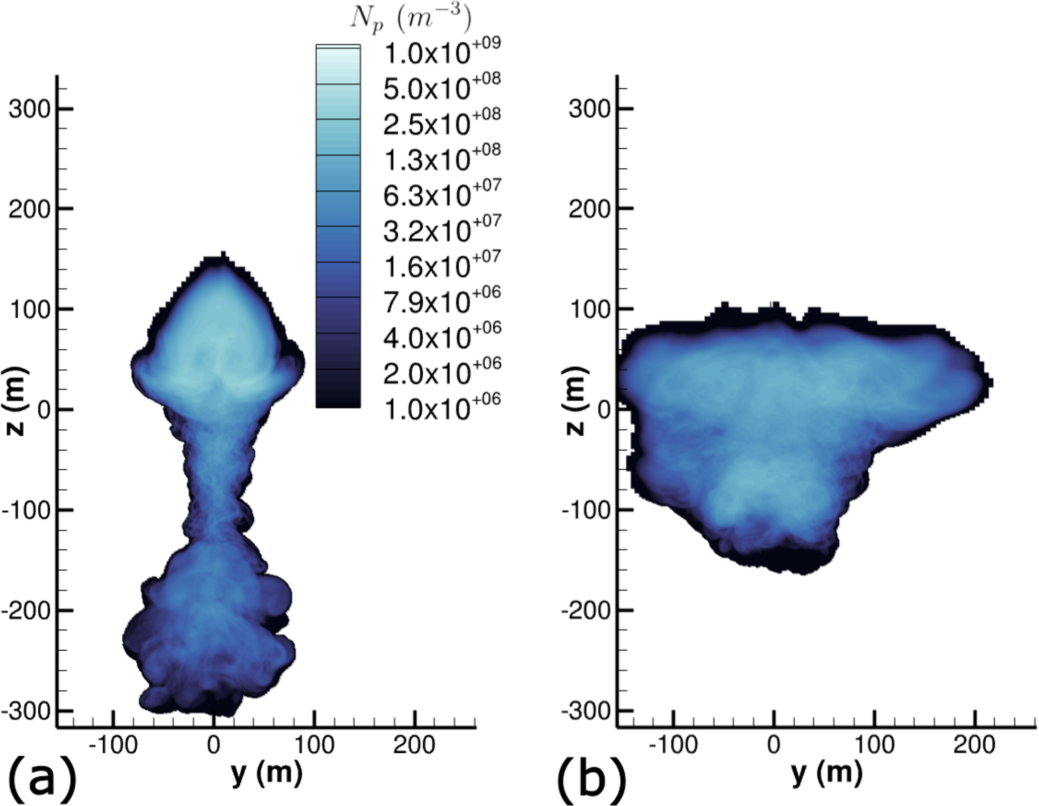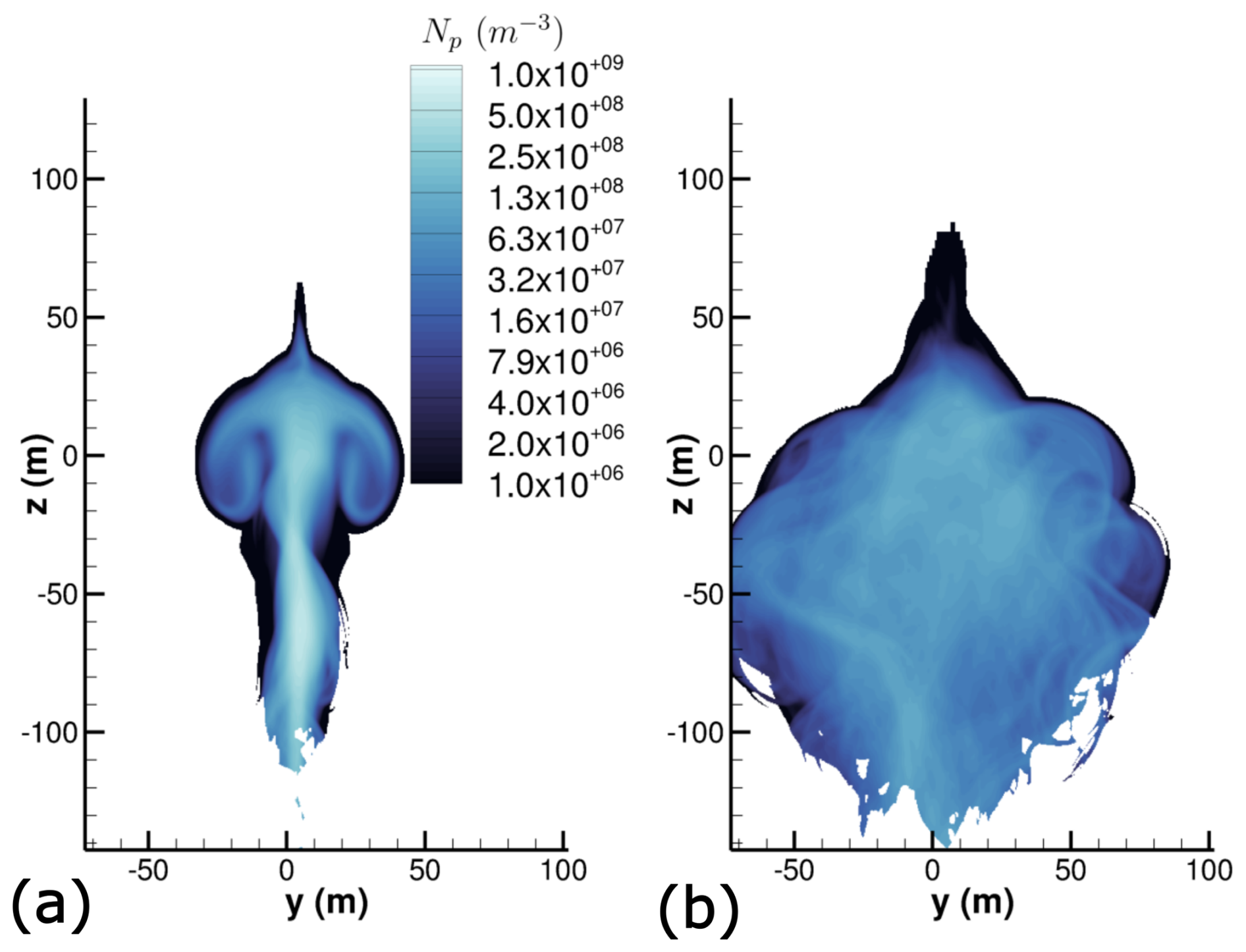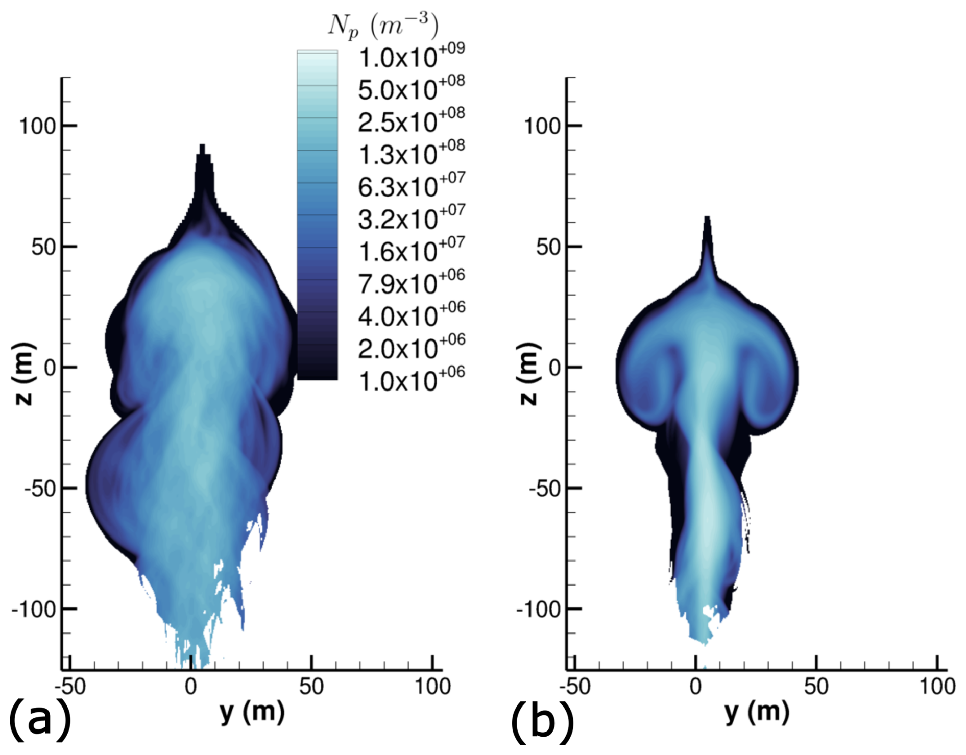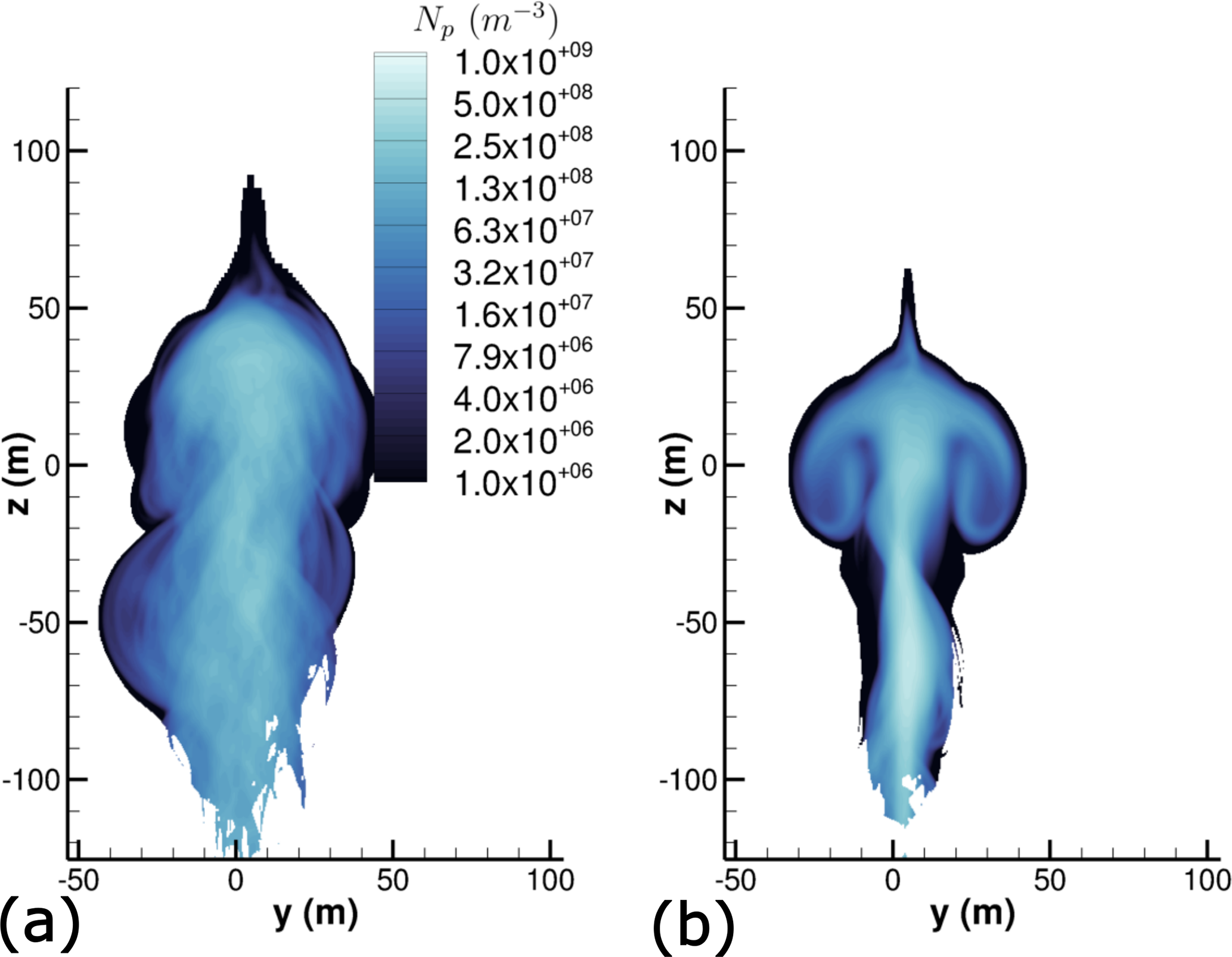 Figure 22Spatially averaged ice crystal number concentration field Np in m−3 at t/tb=8 (tb=25.7 s) and for Nb=0.012 s−1. Comparison between (a) 2LO initialization with RANS plume and (b) 2LO initialization. A logarithmic scale is used for the color levels.
