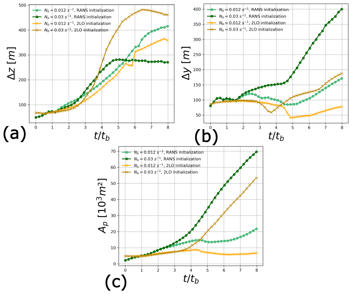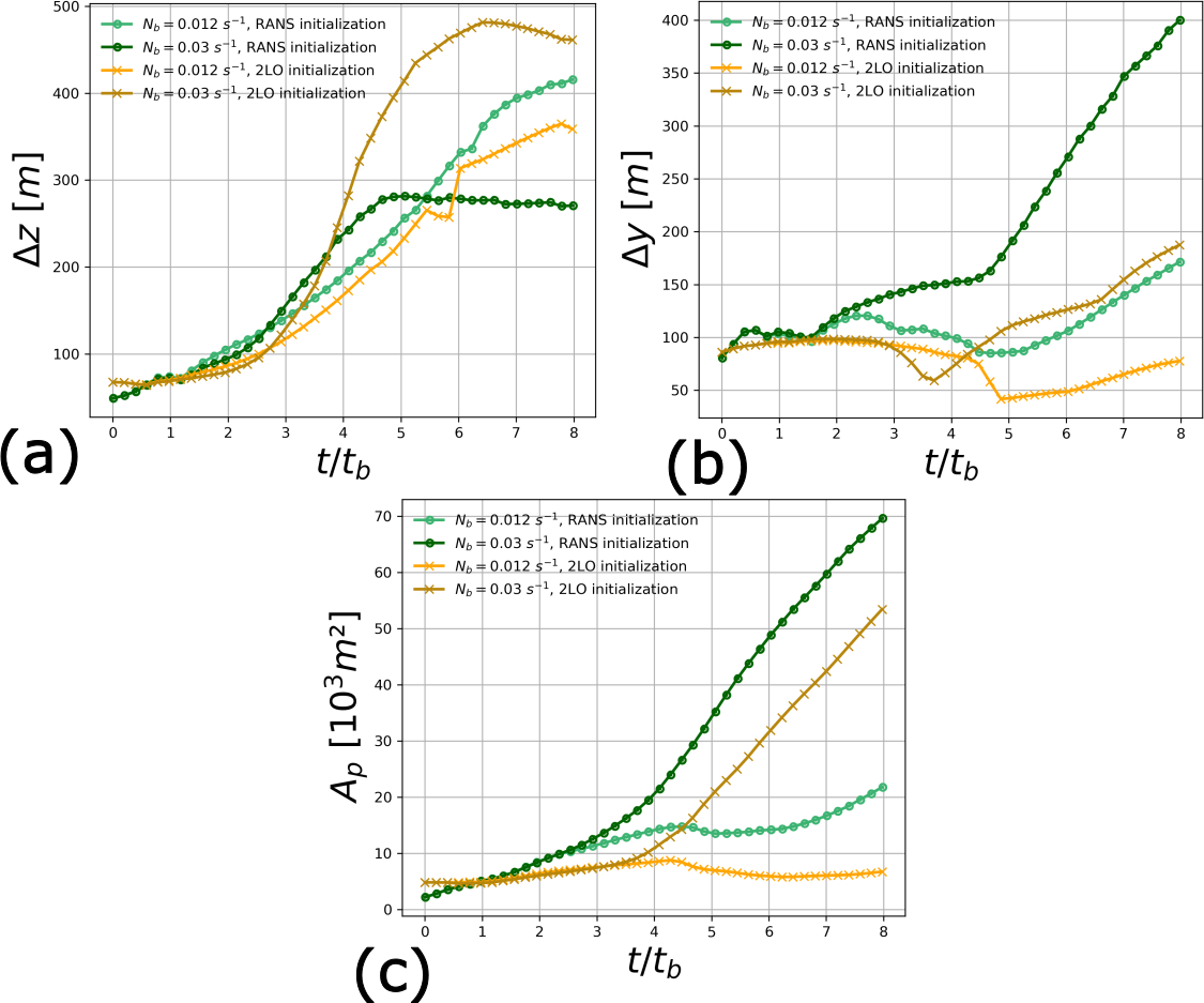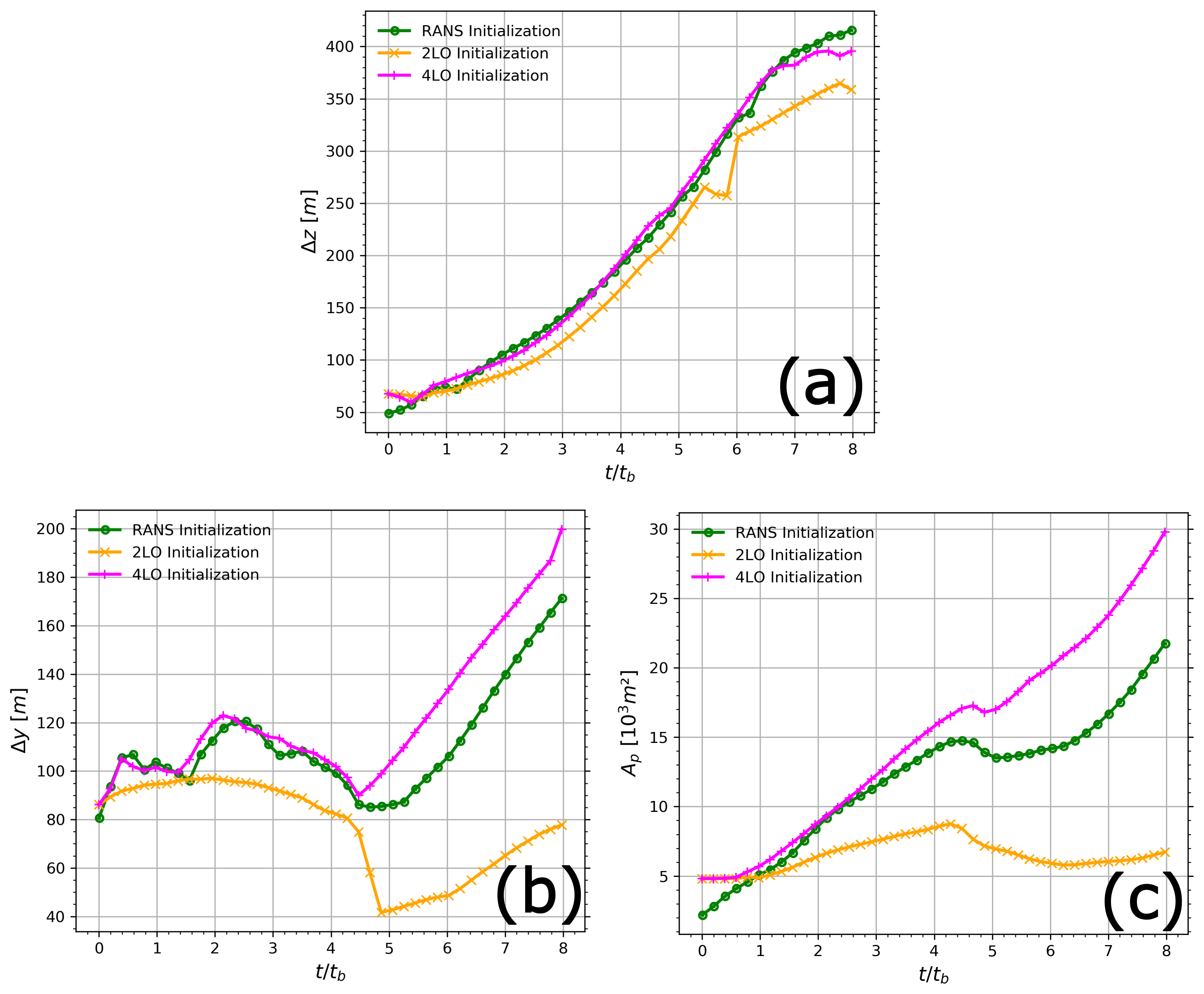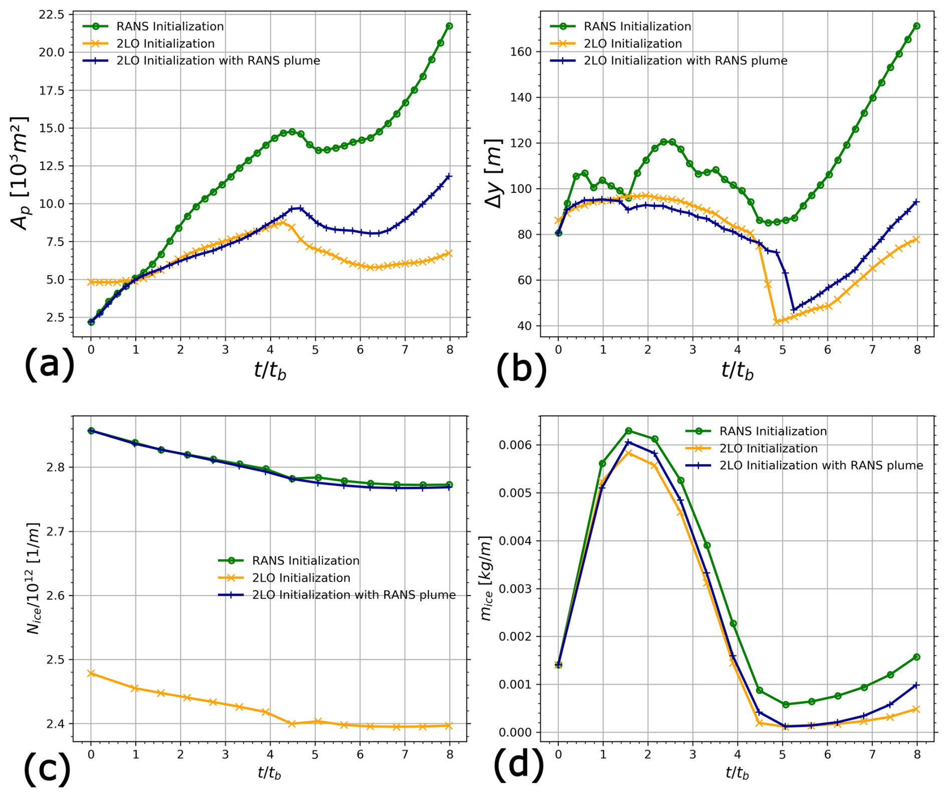 More quantitative comparisons can be made by plotting the evolution of the contrail spatial dimensions in the spatially averaged contrail, the contrail total ice mass per meter of flightpath and the contrail number of ice crystals per meter of flightpath. These quantities are plotted in Fig. 23 for the 2LO initialization, 2LO initialization with RANS plume and the full RANS initialization which is our reference case. We observe that for the vortex regime, that is t/tb<4, the contrail cross-sectional area and the contrail width are very similar between the 2LO initialization and the 2LO initialization with RANS plume despite the initial discrepancies. Some differences arise after the vortex regime. The contrail obtained with the 2LO initialization with the RANS plume is larger than the one obtained with a circular plume. However, the cross-sectional area and width evolution show very similar trends between the two initializations. Moreover, the differences observed are significantly smaller between the 2LO and the 2LO with RANS plume than between the 2LO and the full RANS initialization strategies, indicating a greater impact of the vortex initialization.