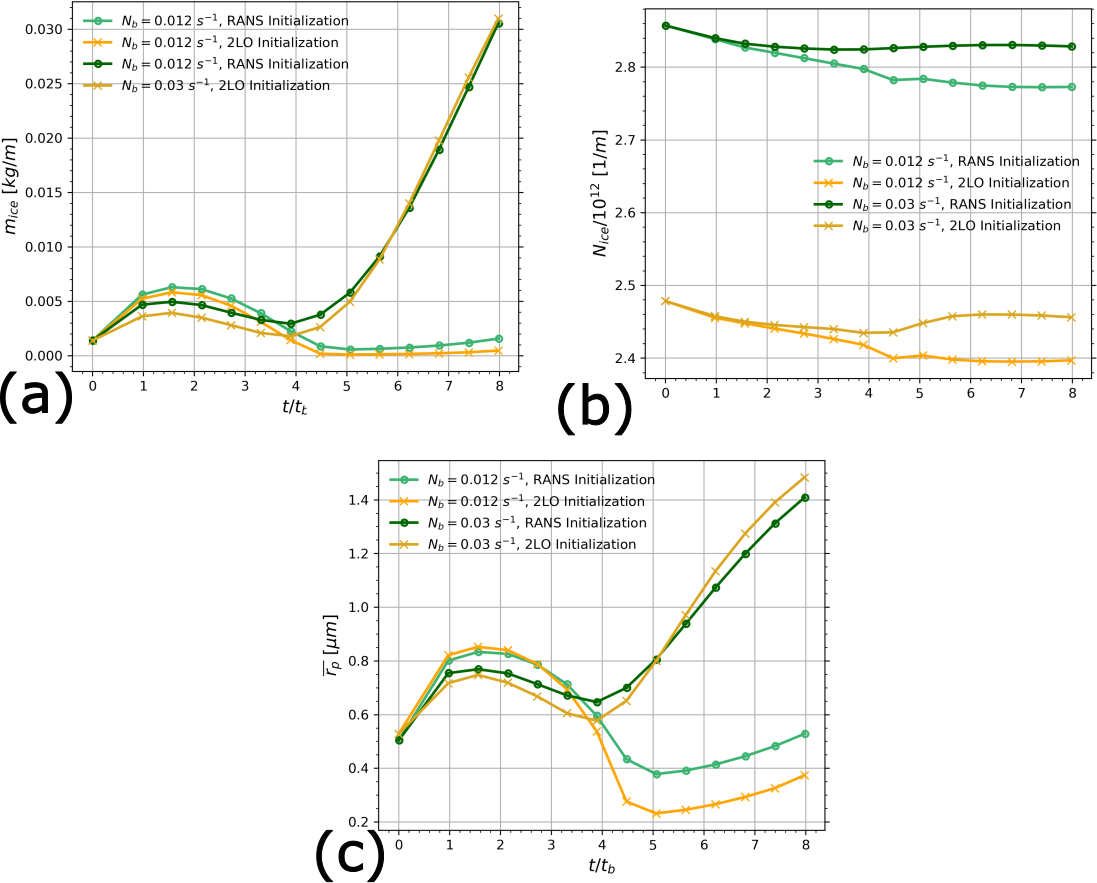 Figure 21Evolution of contrail total quantities for the different LES initialization strategies at Nb=0.012s-1.. (a) Total ice mass per meter of flightpath, (b) total ice crystal number per meter of flightpath and (c) mean ice crystal radius (tb=25.7 s).